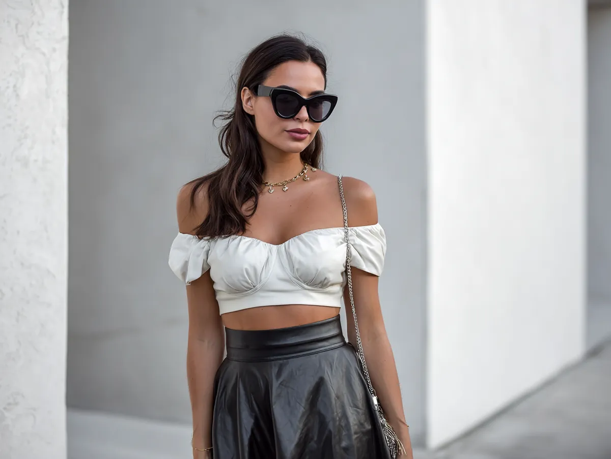 Pairing a high-waisted black leather skirt with a white off-shoulder crop top creates a perfect summer outfit that’s equal parts chic and playful. The off-shoulder design adds a touch of femininity while keeping the look light and breezy, making it ideal for warm days. This combination embraces the contrast between the tough, structured feel of leather and the soft, flowy nature of the crop top.