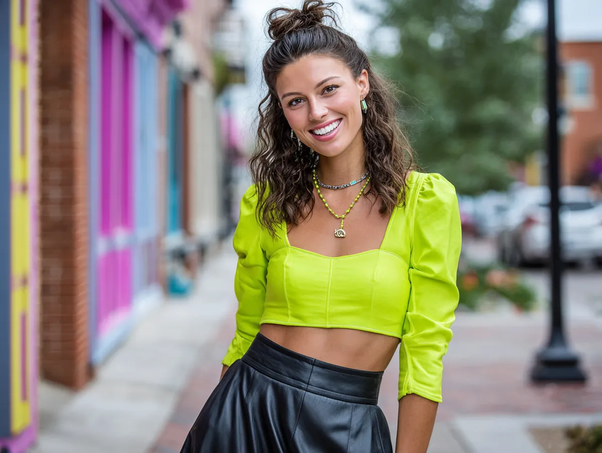 Neon colors are perfect for summer, especially when paired with something as timeless as leather. The combination allows for a vibrant, energetic look that is perfect for daytime adventures or casual summer nights. The black leather pencil skirt grounds the outfit, ensuring that the neon top doesn’t overwhelm the overall look. This balance between structured and bold ensures that you stay stylish while embracing the carefree vibes of the season.