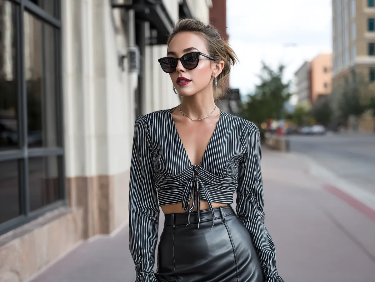 The beauty of this outfit lies in the contrast between the structured shape of the leather skirt and the casual, playful nature of the striped crop top. Stripes add a sense of fun, making this ensemble ideal for daytime activities like visiting the beach or hanging out at outdoor festivals. The leather skirt keeps the look polished and fashionable, ensuring that even the most casual event feels stylish.
