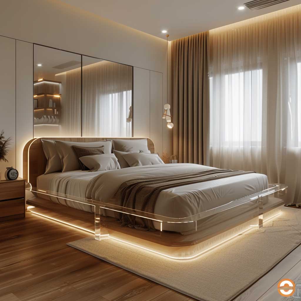 Imagine a modern bedroom featuring a sleek acrylic bed frame with clean lines and a minimalist design. Soft lighting enhances the transparency of the acrylic, creating an ethereal glow that adds to the room’s overall ambiance. Complemented by neutral-colored bedding and a few well-chosen accessories, the acrylic bed frame becomes the focal point of the room without overwhelming the space.
