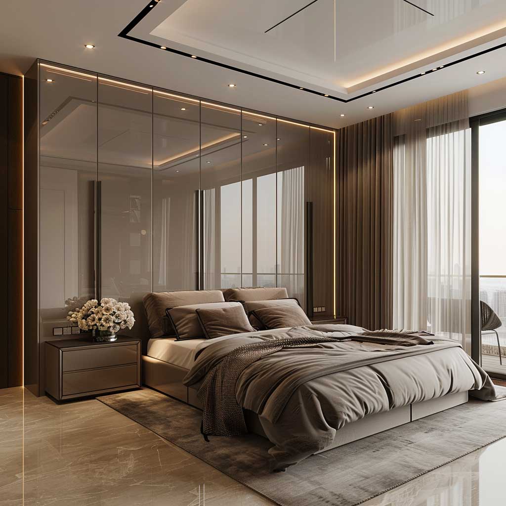 Envision a modern bedroom with an elegant acrylic wardrobe featuring transparent doors and minimalist handles. Set against a backdrop of sophisticated decor, this wardrobe becomes a statement piece that enhances the room’s overall aesthetic. The transparency of the acrylic allows the wardrobe to blend seamlessly with other furniture pieces, creating a cohesive and stylish look.