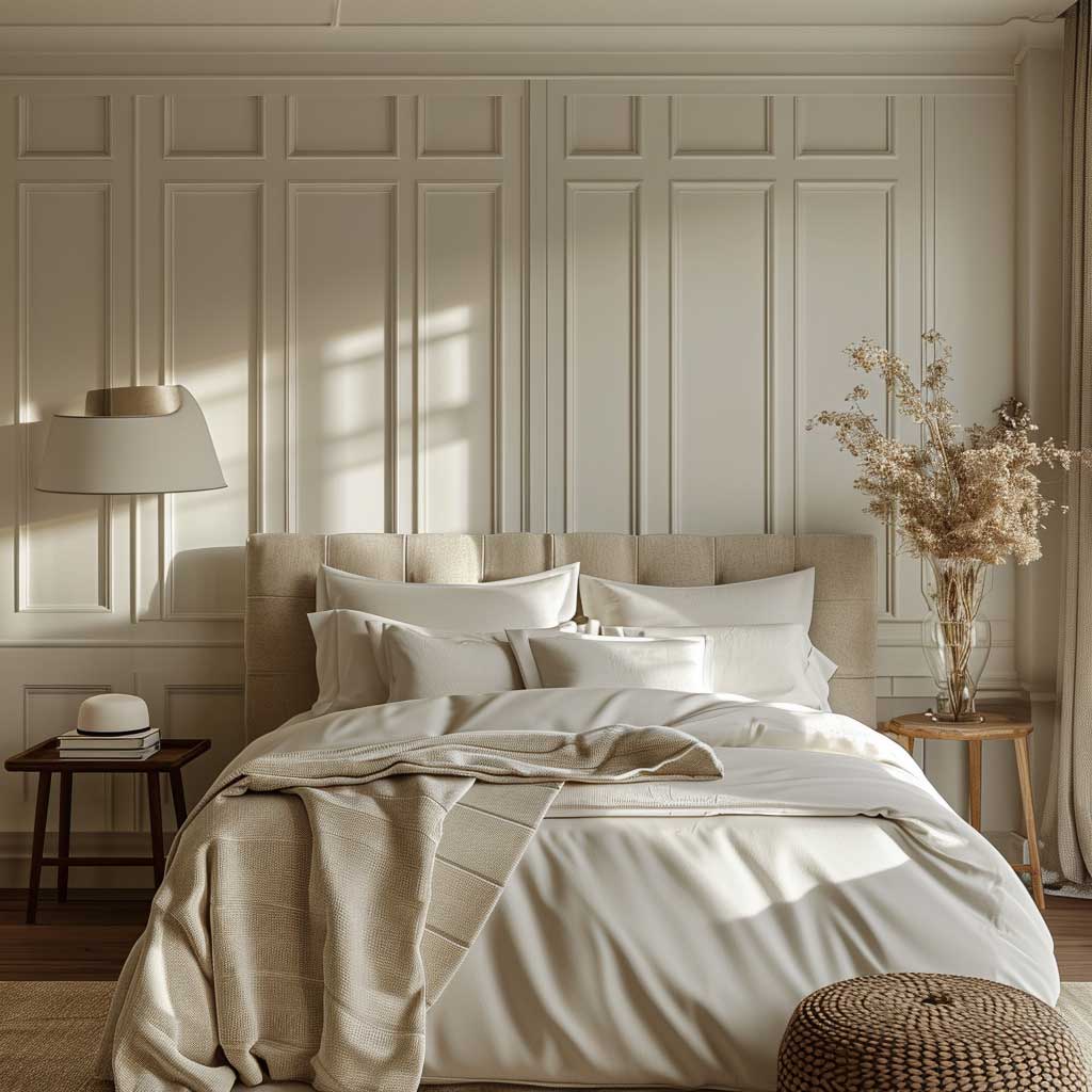 Incorporating soft textures and layers is crucial in amplifying the coziness of a white-paneled bedroom. Think plush area rugs, luxurious bedding, and an array of pillows and throws that invite you to curl up and relax. The contrast between the soft furnishings and the structured paneling creates a balance that is both visually appealing and comforting.