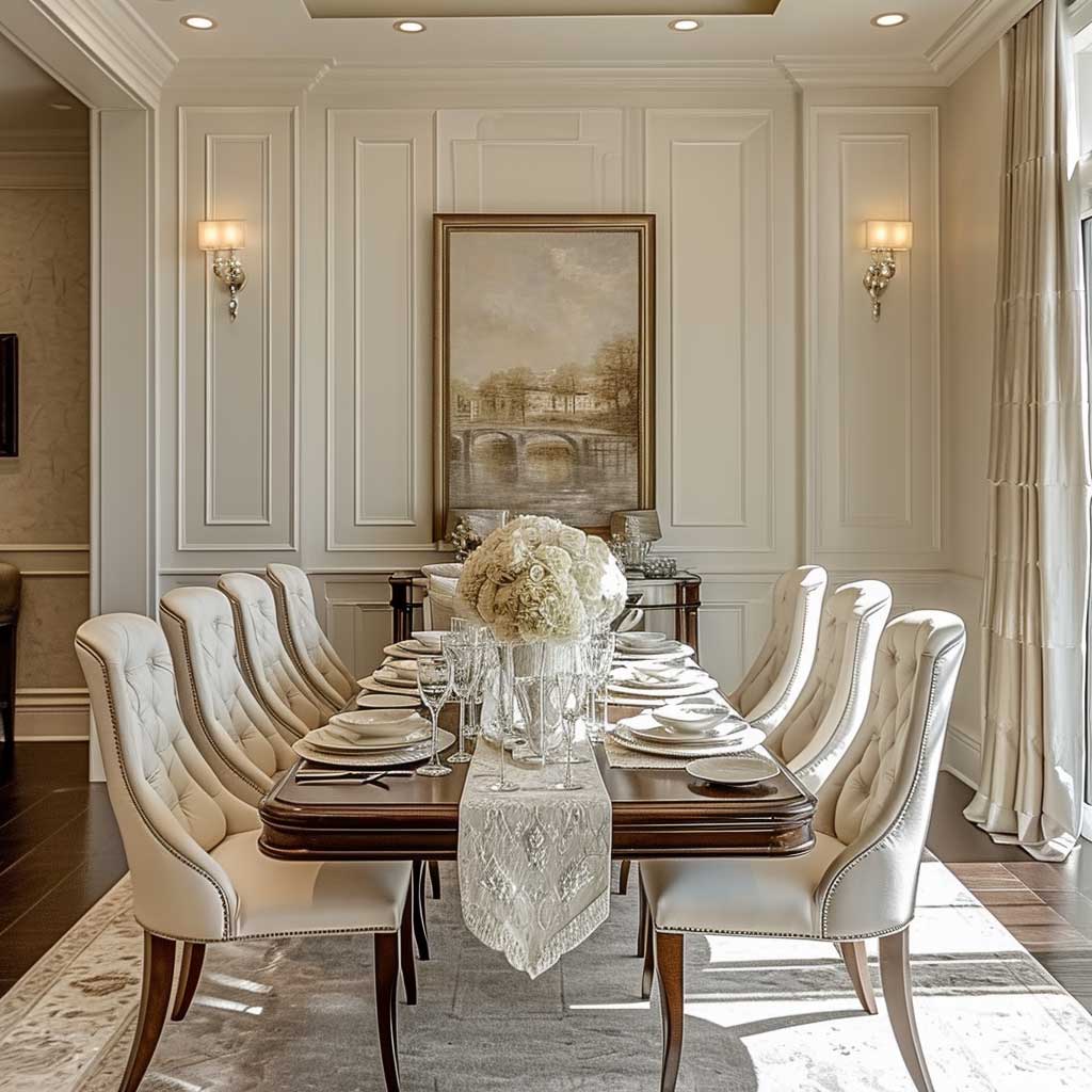 Decorating a white-paneled dining room offers endless possibilities. Bold artwork, statement light fixtures, and vibrant table settings can stand out against the white backdrop, adding personality and flair. Alternatively, a monochromatic color scheme with varying textures can create a look that is both sophisticated and understated.