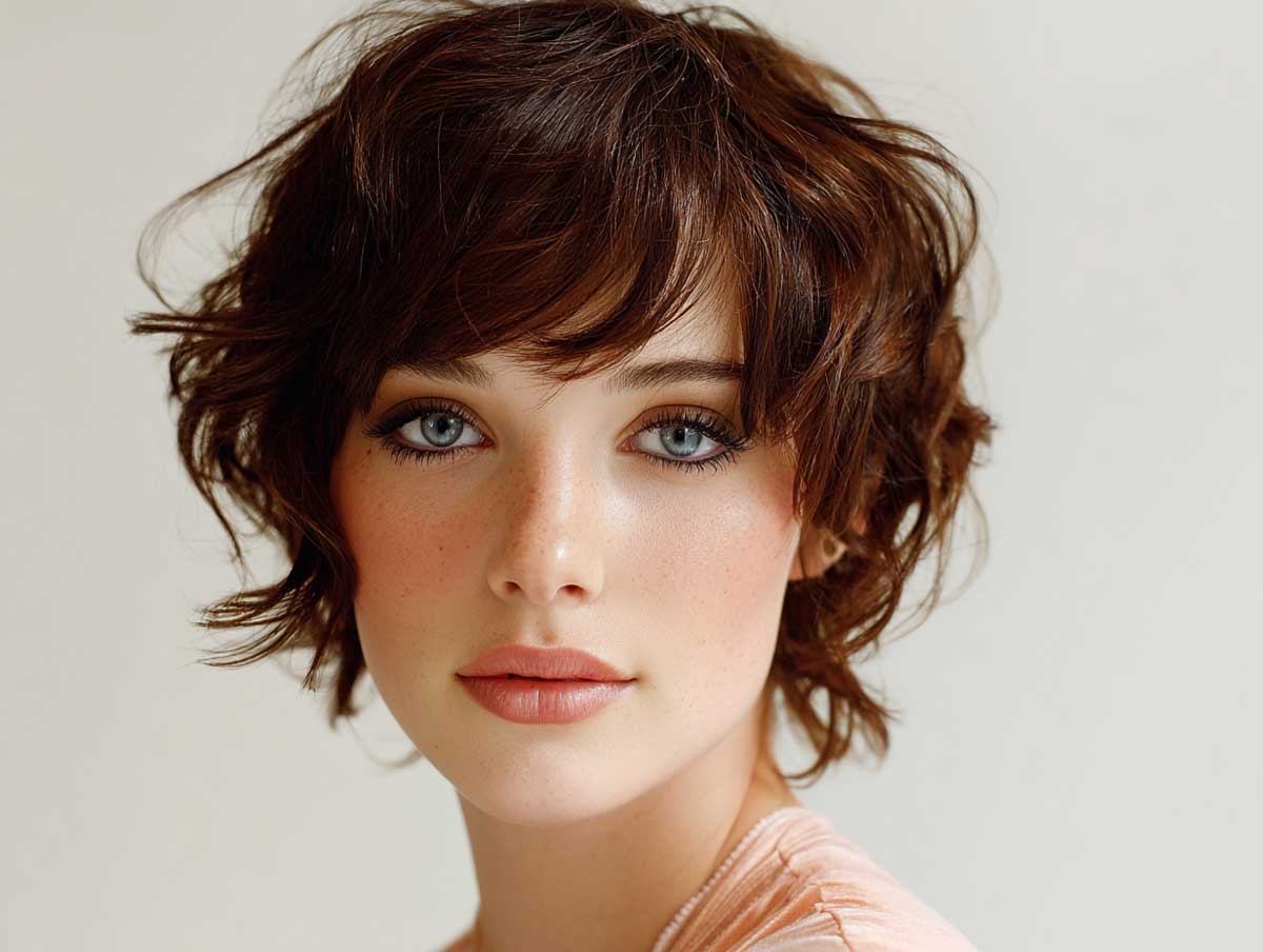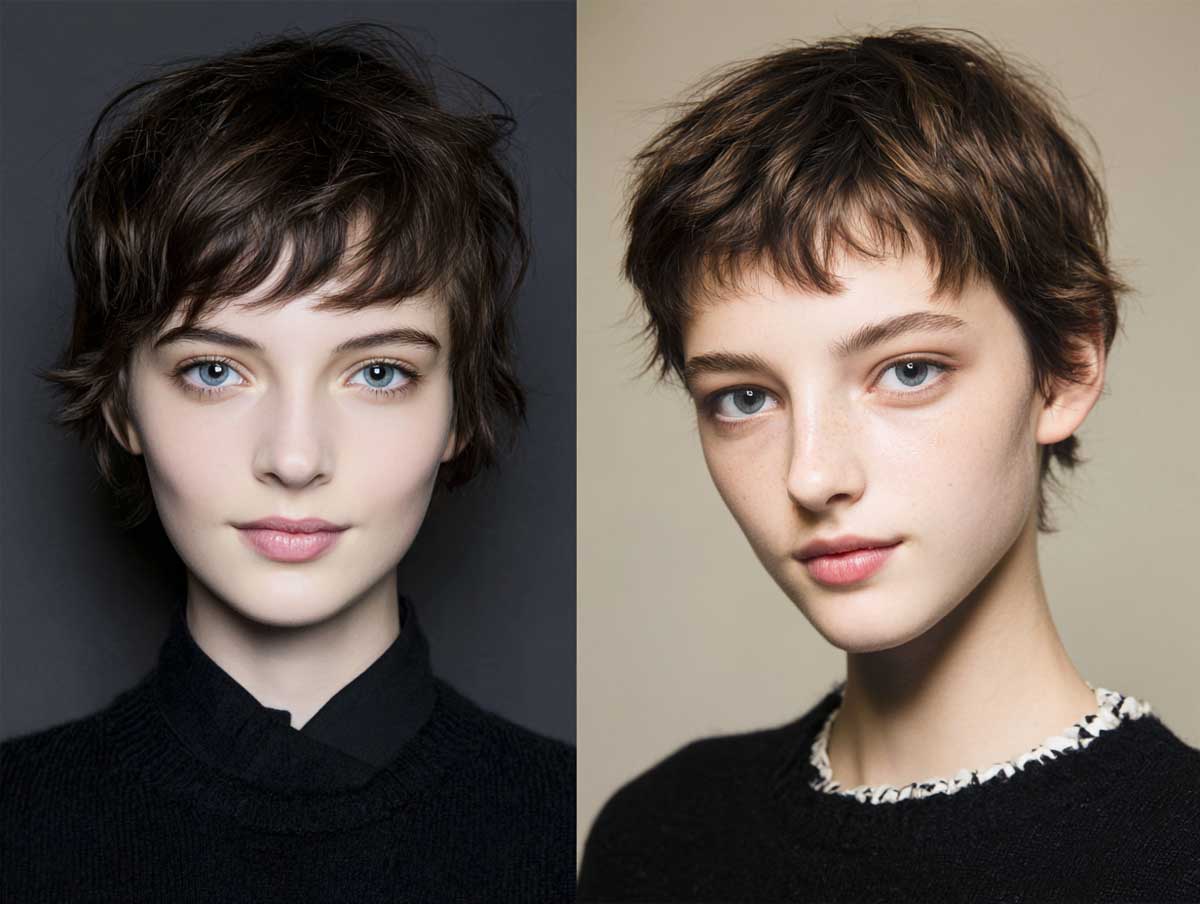 The overall shape of this haircut serves a very specific purpose. Rather than drawing attention down, it keeps the focus centered by framing the lower half of the face. These short choppy layers widen the visual appearance of the jaw area, helping to offset the elongated midsection of a long face.