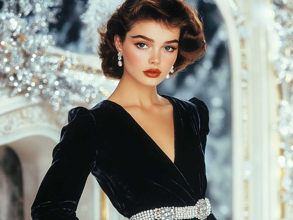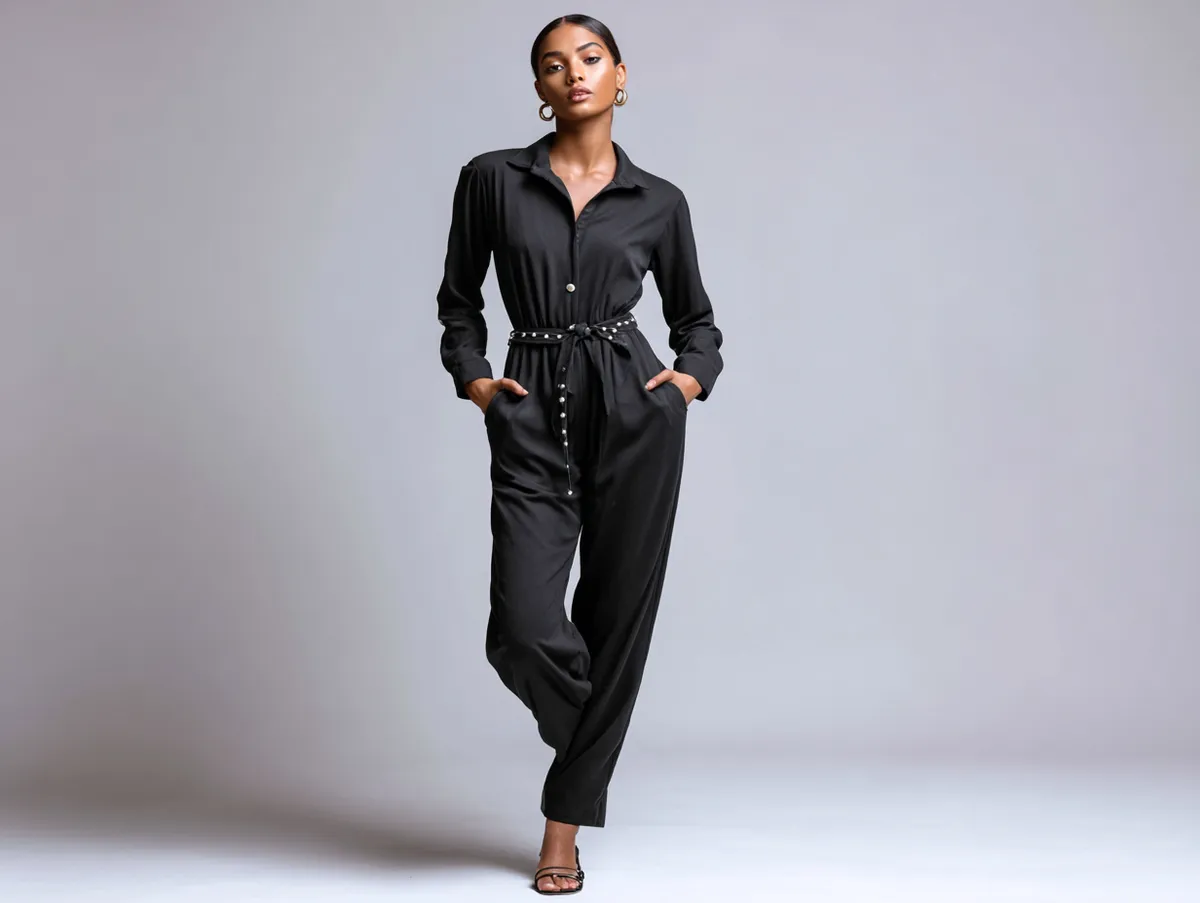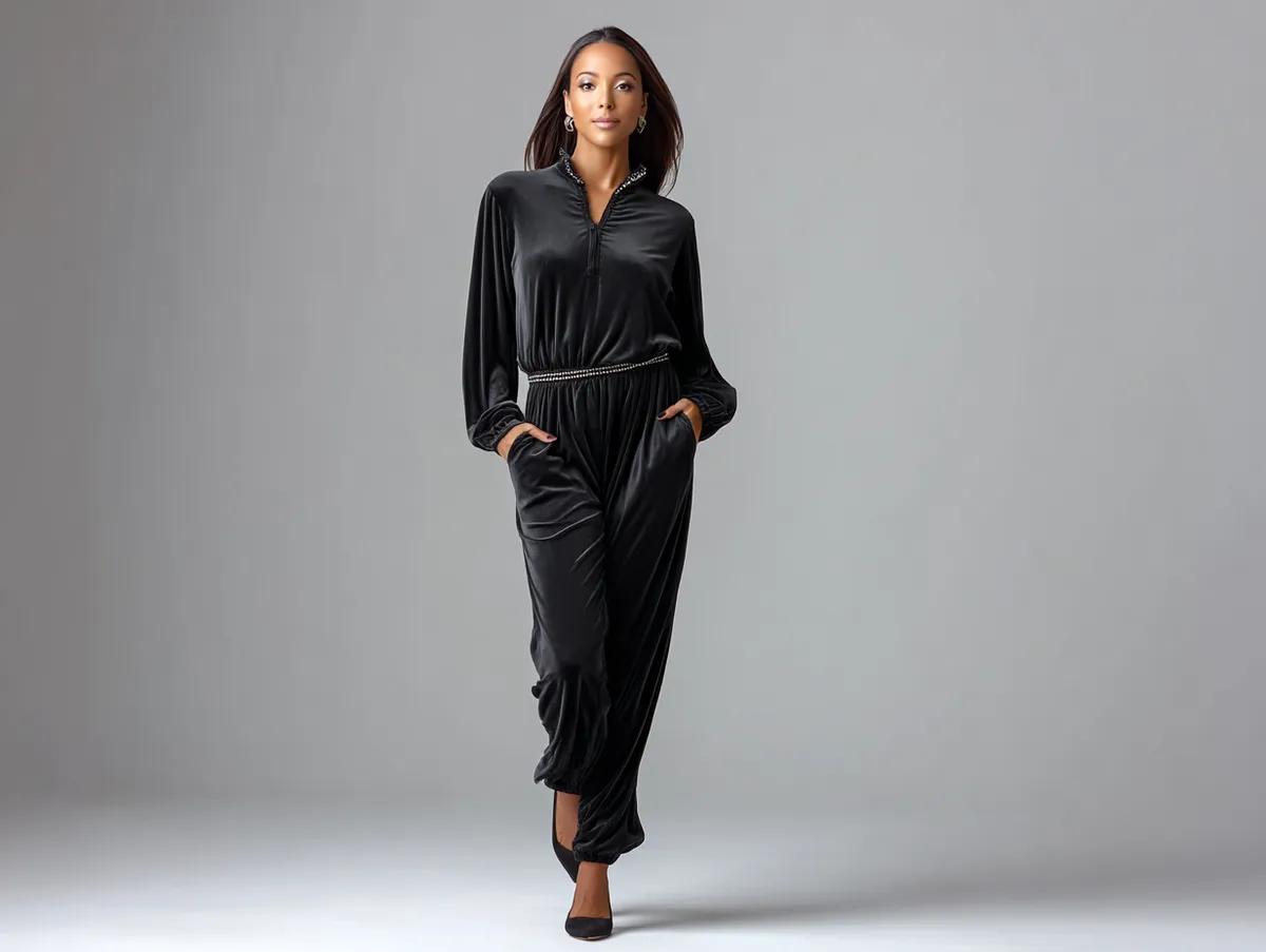 Black velvet jumpsuits are synonymous with luxury and sophistication, making them a go-to choice for the holiday season. Adding a pearl-detailed belt enhances the opulence, creating a harmonious blend of texture and refinement. The softness of velvet combined with the elegance of pearls embodies understated glamour.