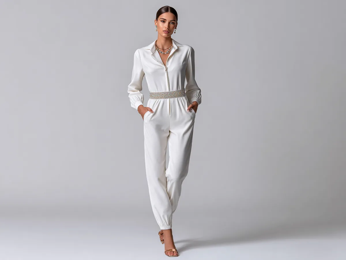 A pearl belt with intricate designs or layered strands adds a classic twist to the contemporary silhouette of a jumpsuit. This look works beautifully with pearl drop earrings and a sleek bun or softly curled hair. The monochromatic palette allows the belt’s delicate details to take center stage.