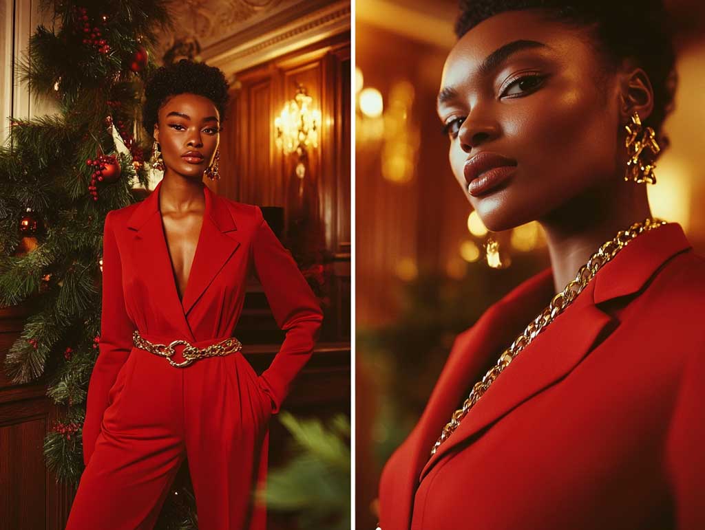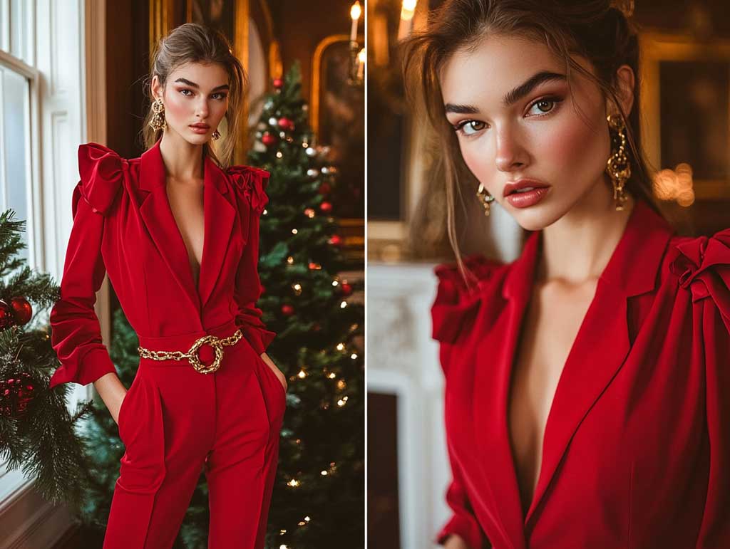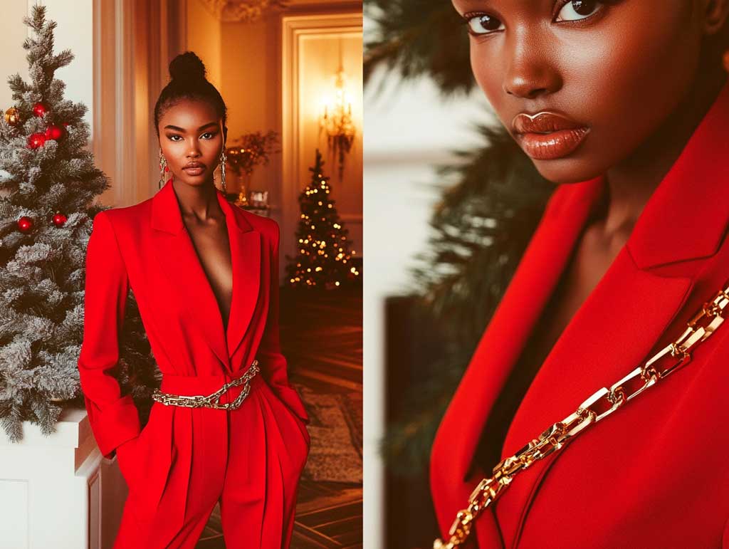 A red jumpsuit, for example, becomes a head-turner when accessorized with a chunky gold belt featuring interlocking chain designs. This combination celebrates the festive spirit while ensuring you stay fashion-forward. Style it with gold hoop earrings and a sleek hairstyle to maintain a cohesive aesthetic.