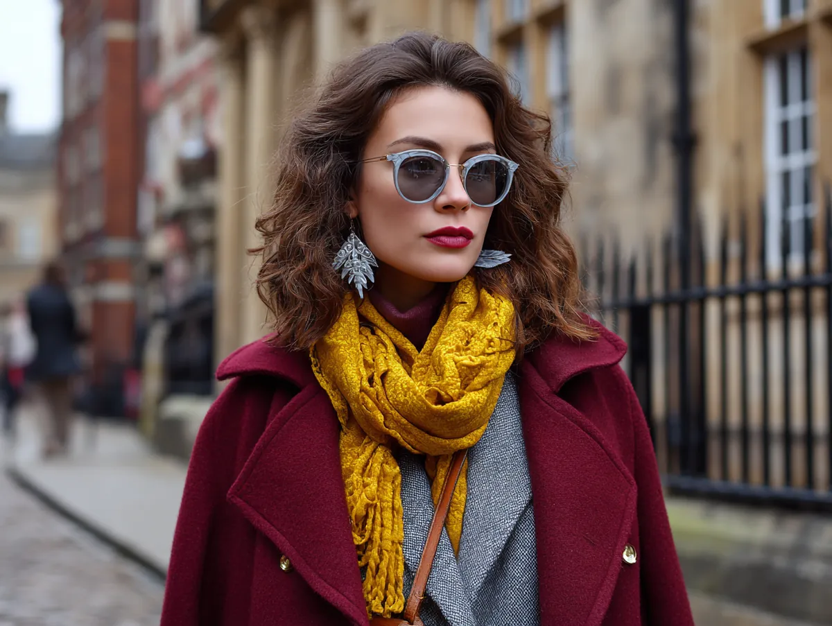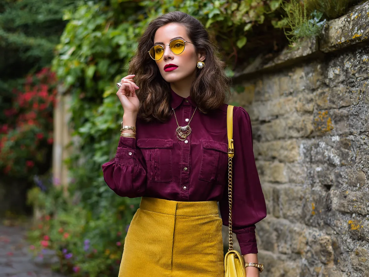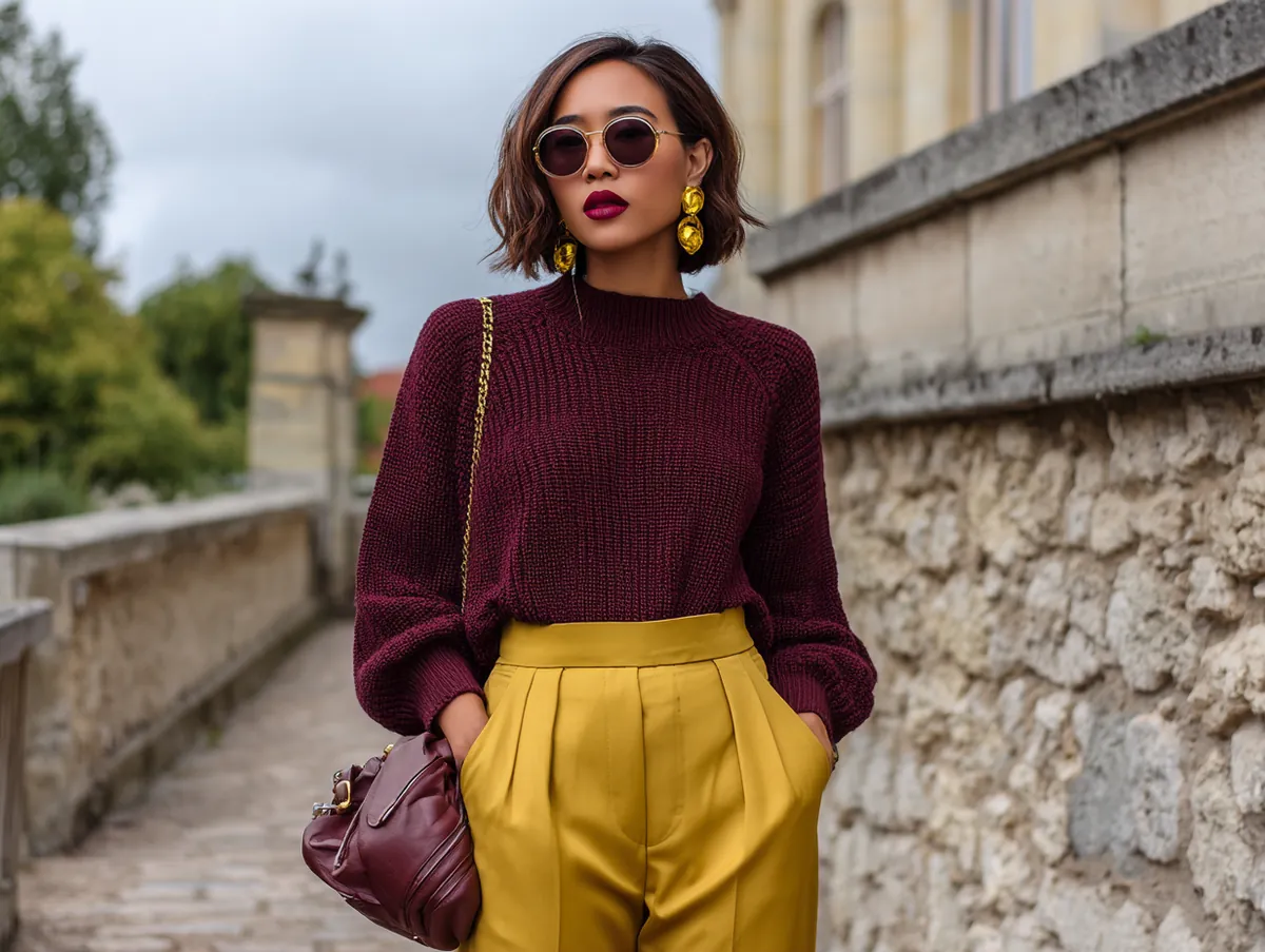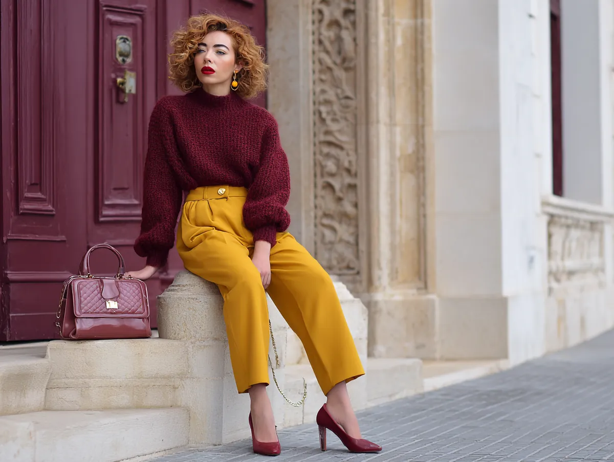 Mustard trousers bring a touch of brightness to the outfit without overwhelming the deeper tones of burgundy. High-waisted trousers in this shade elongate the figure while adding a modern twist to the classic fall palette. The mustard hue acts as a neutral but lively base, making the outfit feel vibrant yet grounded in autumn tones.