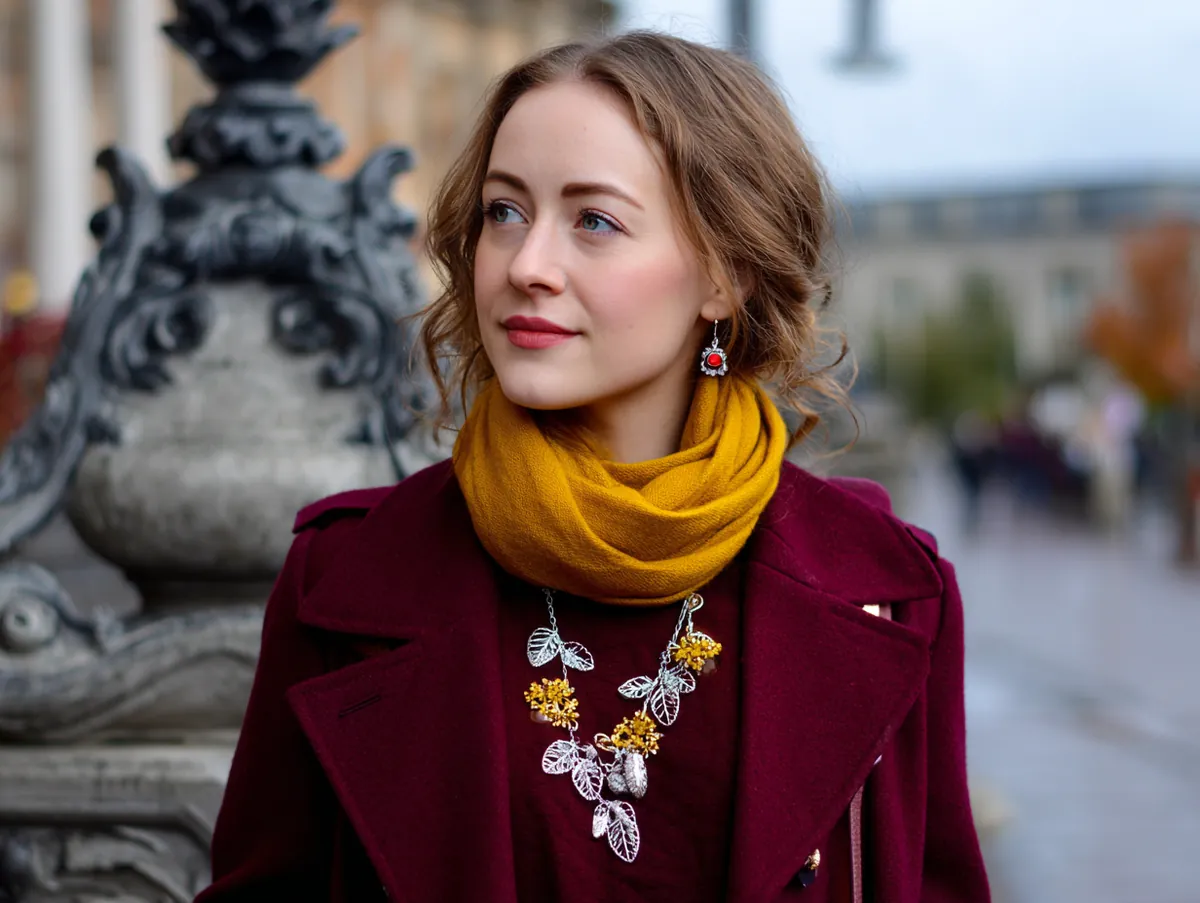 A burgundy wool coat paired with a mustard scarf creates a timeless and elegant look, ideal for urban settings in the fall. The deep, rich hue of the burgundy coat is not only stylish but also practical, providing warmth and sophistication as temperatures drop. A well-fitted wool coat instantly elevates any autumn outfit, becoming a statement piece that can be worn daily while still feeling fresh and chic.