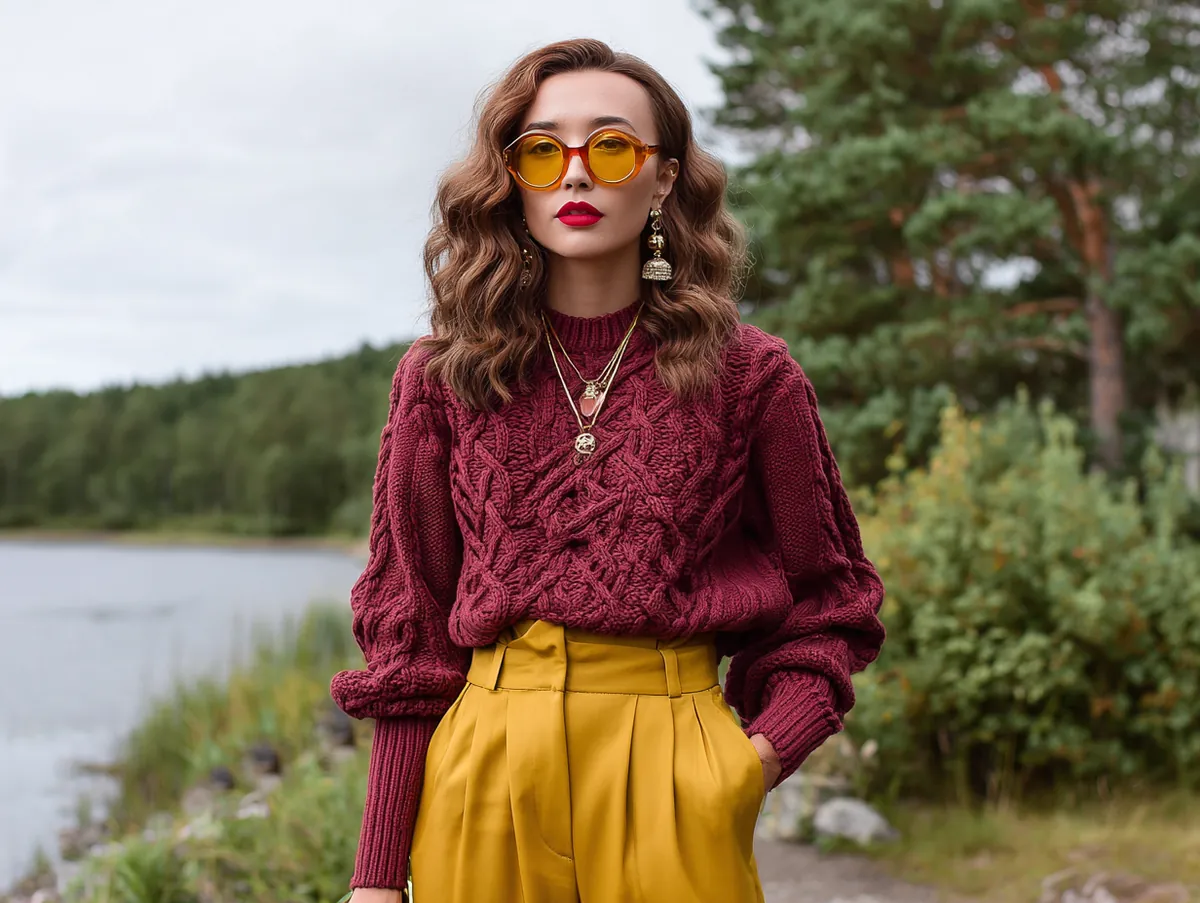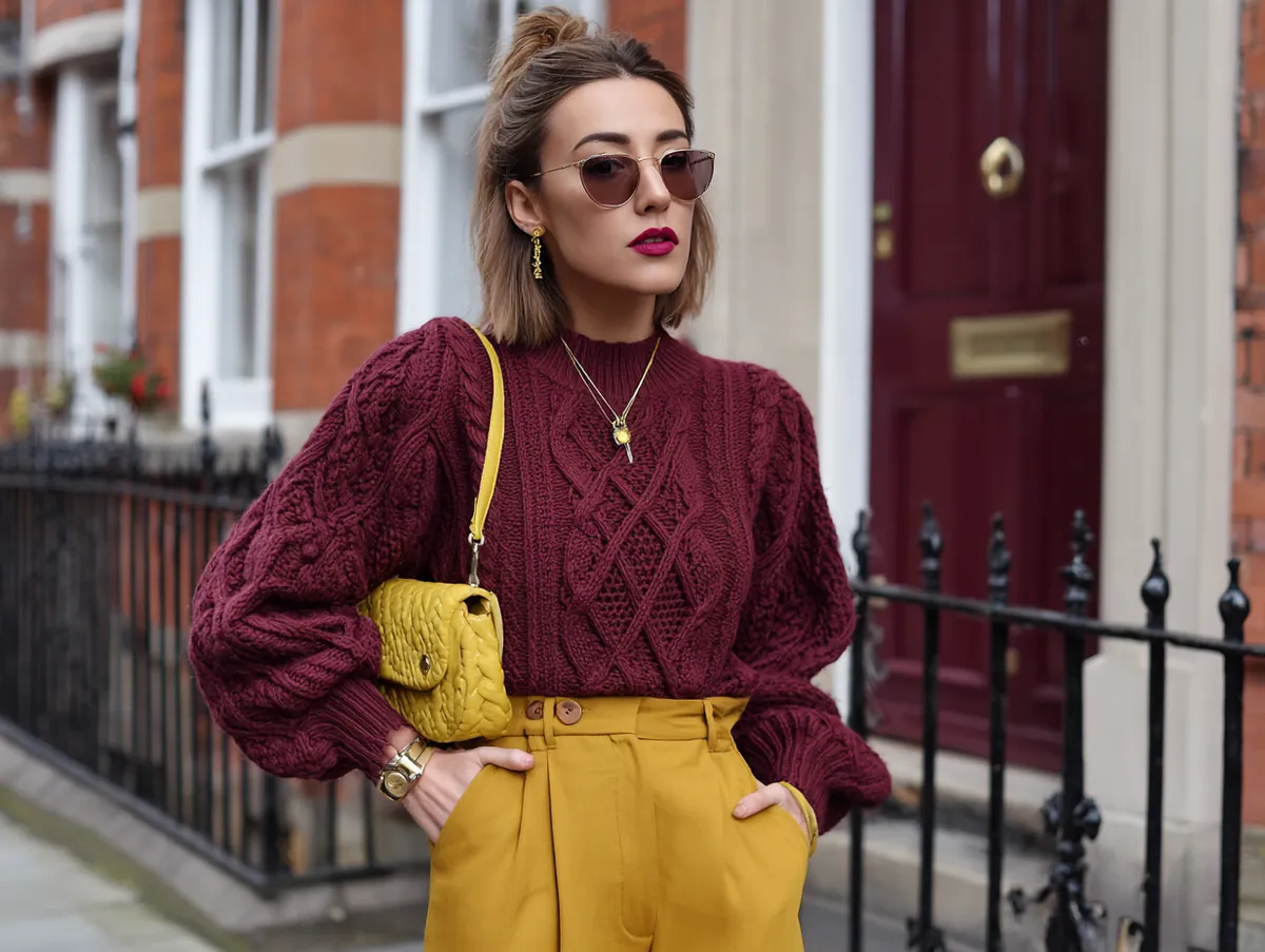 One of the best ways to stay cozy and stylish during the fall season is by pairing a burgundy knit sweater with mustard trousers. These rich autumn hues naturally complement each other, creating a warm, inviting look perfect for the crisp, cool air. The chunky knit of the burgundy sweater adds texture and warmth, making it ideal for layering. Its deep hue reflects the richness of autumn, evoking feelings of comfort and seasonal beauty.