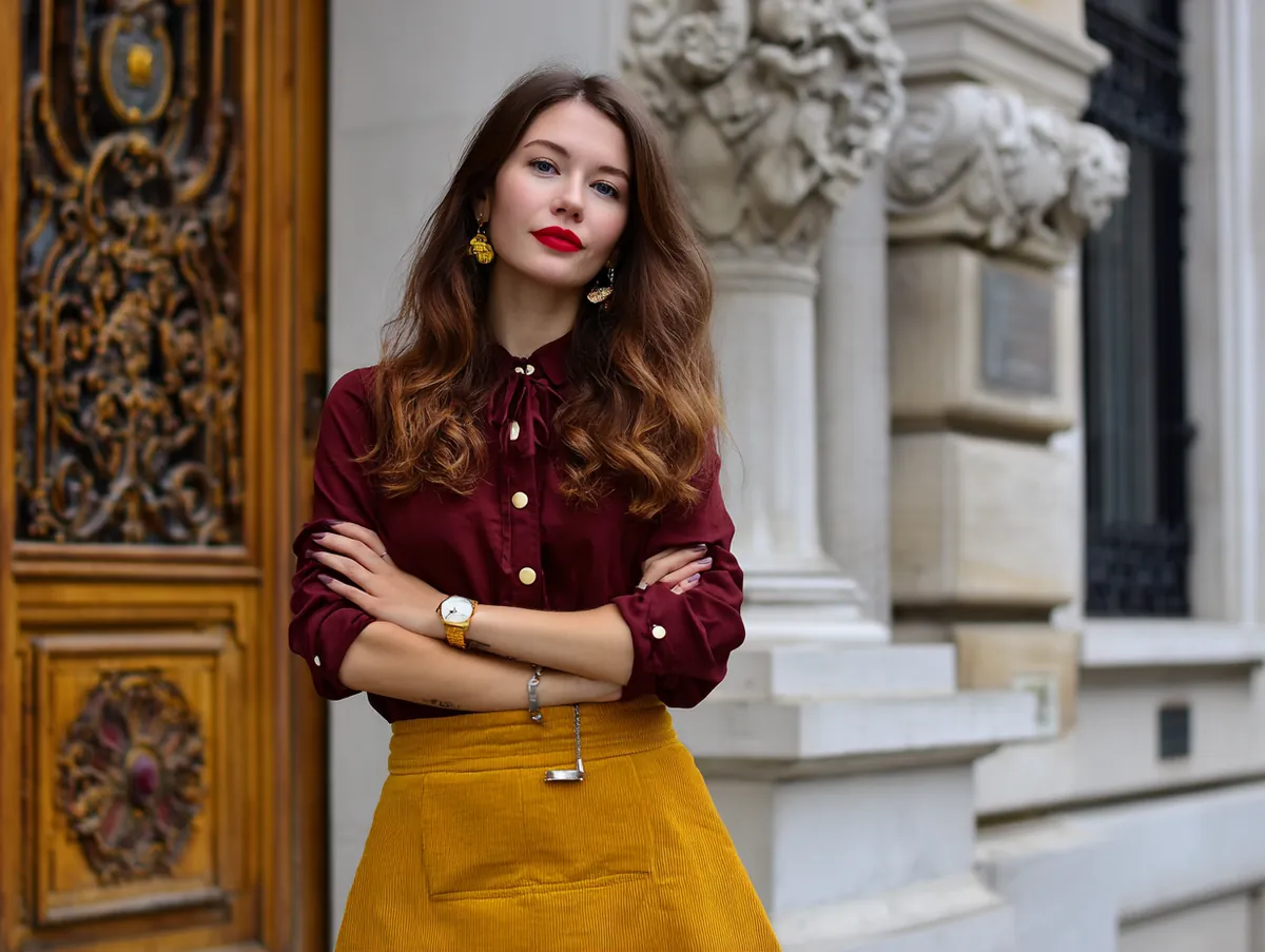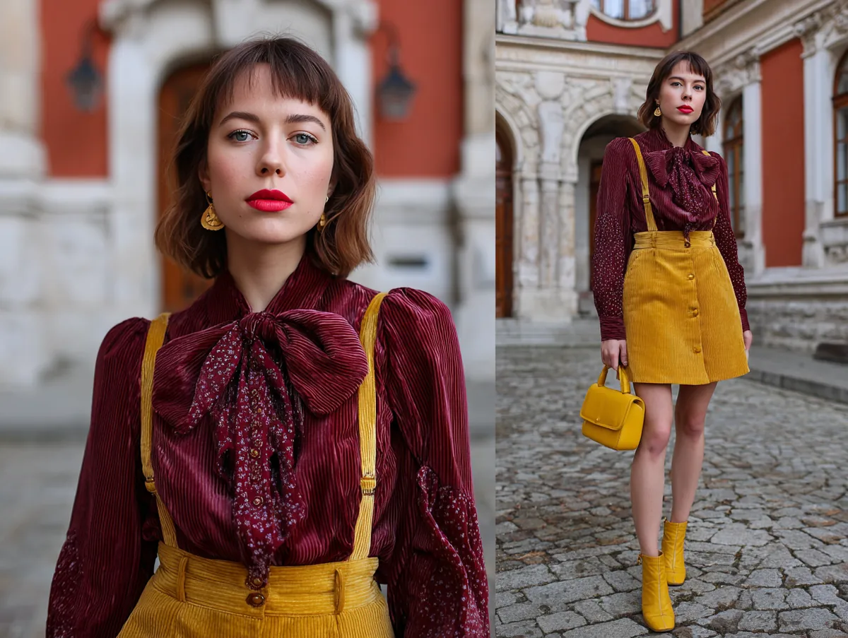 The deep burgundy blouse offers a sophisticated contrast to the mustard skirt. The richness of burgundy exudes elegance while remaining playful, providing the outfit with a sense of depth and balance. Long sleeves and a delicate collar or ruffles add an extra touch of femininity to the look, making it ideal for both casual and semi-formal occasions during the cooler months.