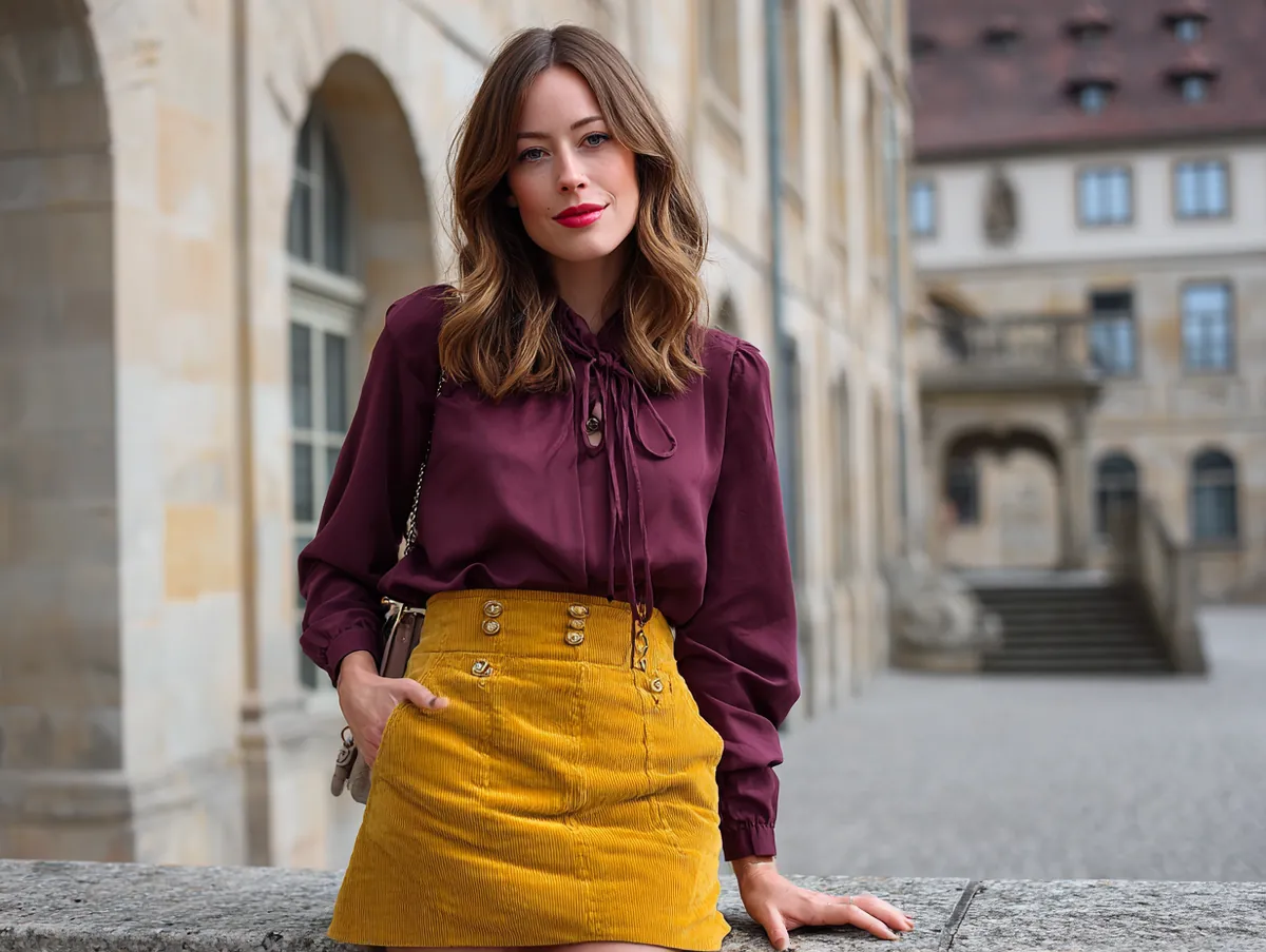Autumn Outfit Ideas with Mustard Corduroy Skirt and Burgundy Blouse