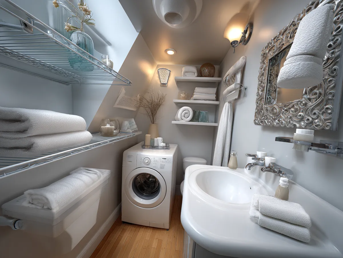 The photograph showcases a loft bathroom design idea that capitalizes on available space innovatively. Despite the size constraints, the bathroom exudes a warm, cozy ambiance, indicative of thoughtfully planned and executed design.