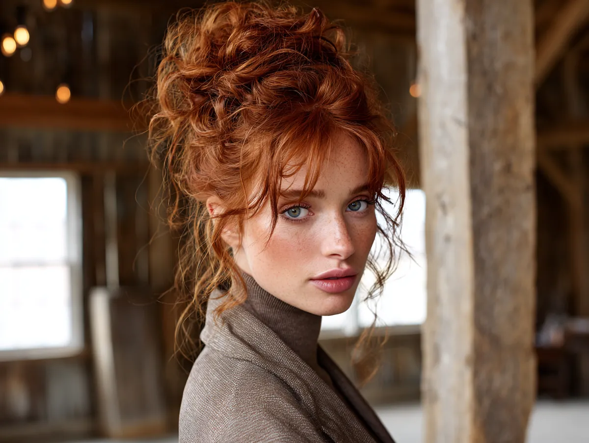 Copper red shades bring fiery warmth to messy updos for medium hair, making them ideal for people who want a style that feels both playful and captivating. The twisting and pinning process begins with loosely waved sections to create volume. The strands are gathered and secured into a textured bun, with intentional pieces left out for softness.