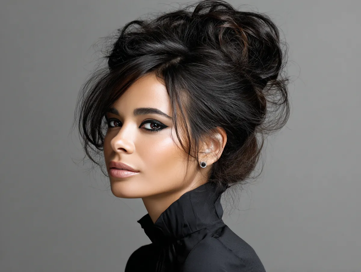 One of the strengths of this look is how well it holds throughout the day or night. The natural weight of medium black hair keeps twists secure while allowing strands to fall loosely around the face and neckline. A flexible-hold hairspray helps maintain the structure without erasing the relaxed vibe. Messy updos for medium hair rely on this combination of durability and softness.