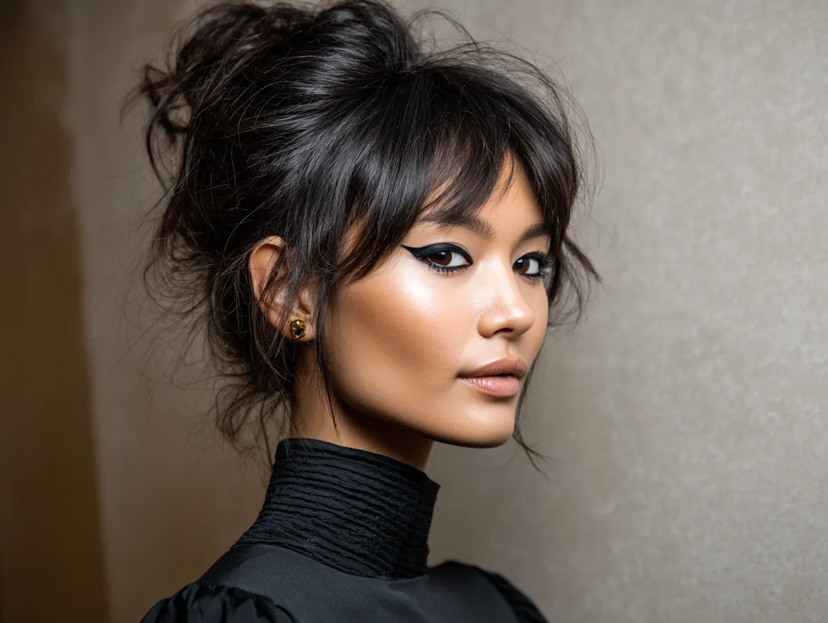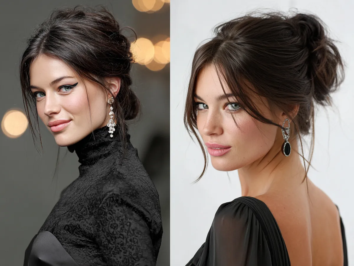 The result is a style that feels powerful and elegant without being rigid. Jet black shades make the casual texture more striking, proving that messy updos for medium hair can be bold, confident, and endlessly versatile.