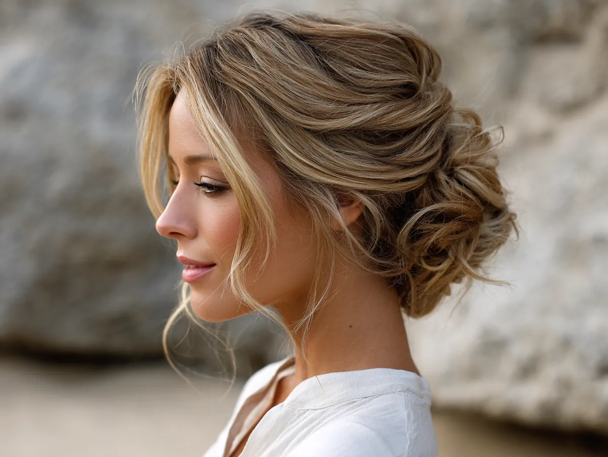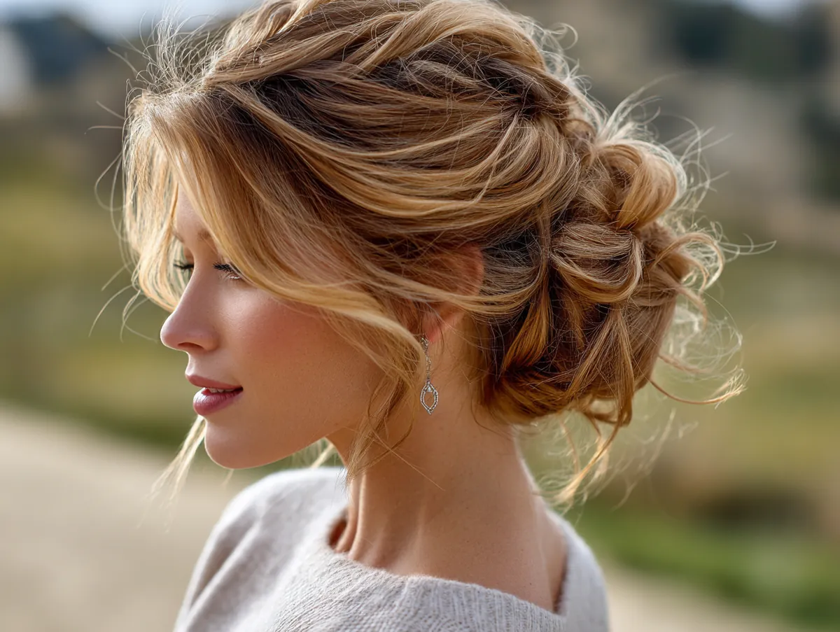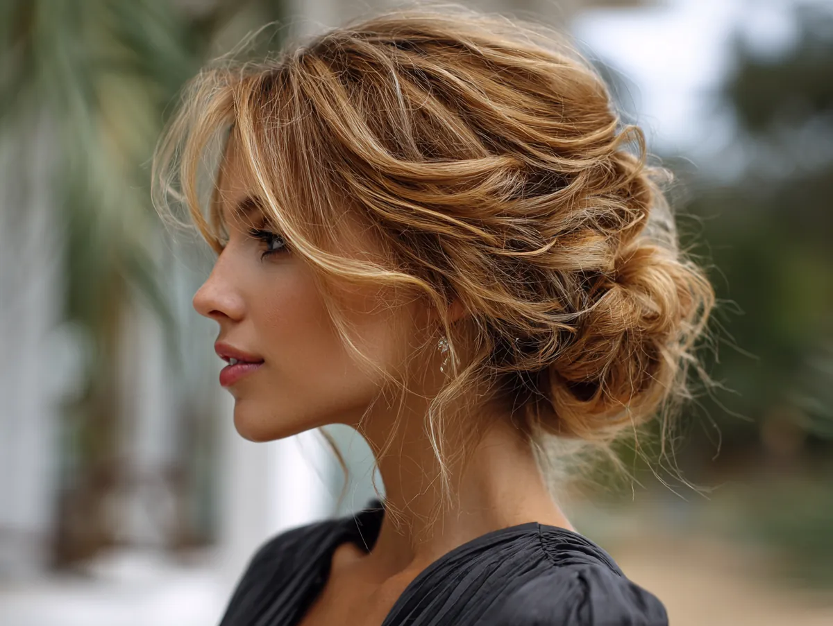 Maintaining the style is simple. A light texturizing spray provides grip while keeping the strands touchable. Unlike more rigid styles, messy updos for medium hair are meant to evolve throughout the day, with a few pieces shifting naturally. This only adds to their charm, reinforcing the carefree energy of honey blonde tones.