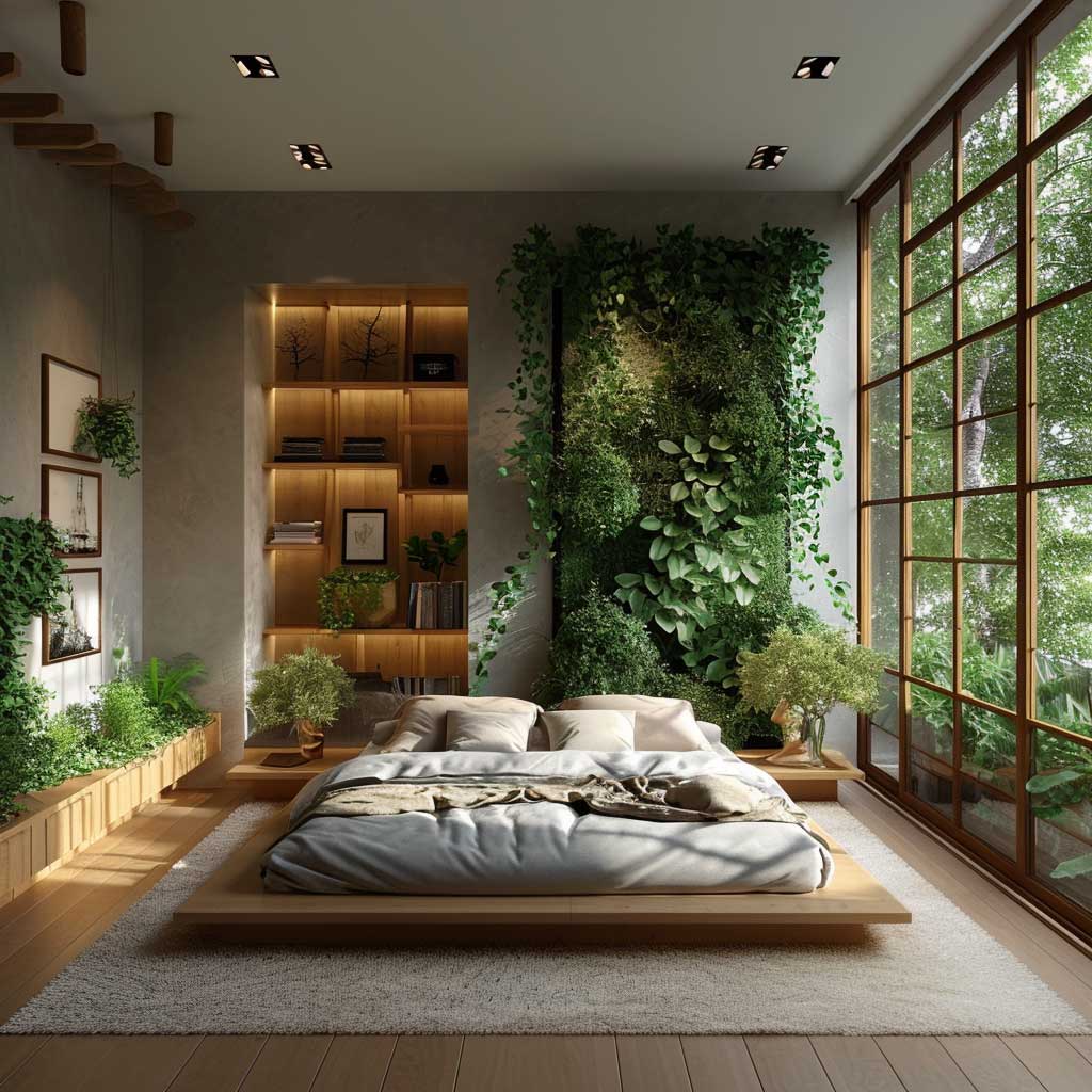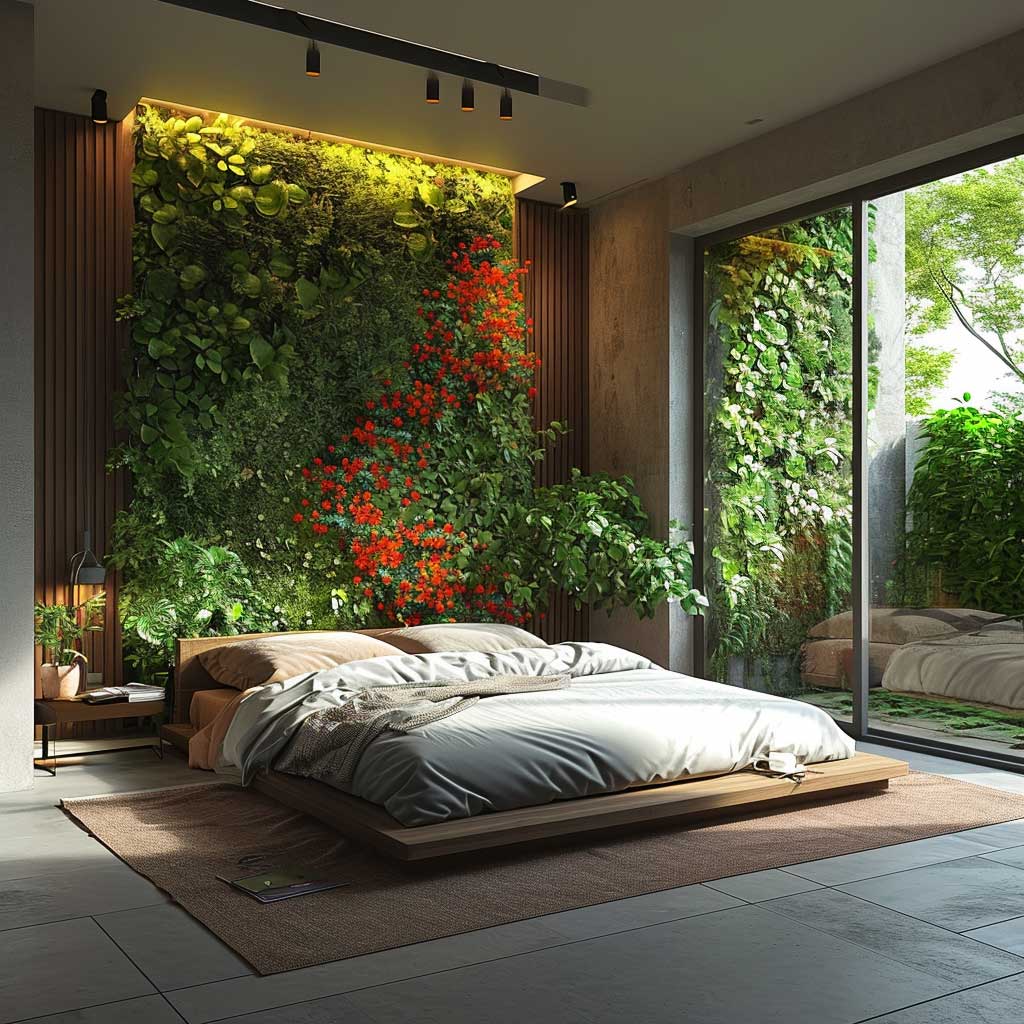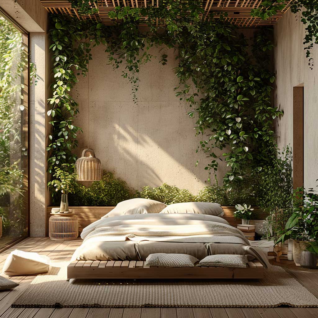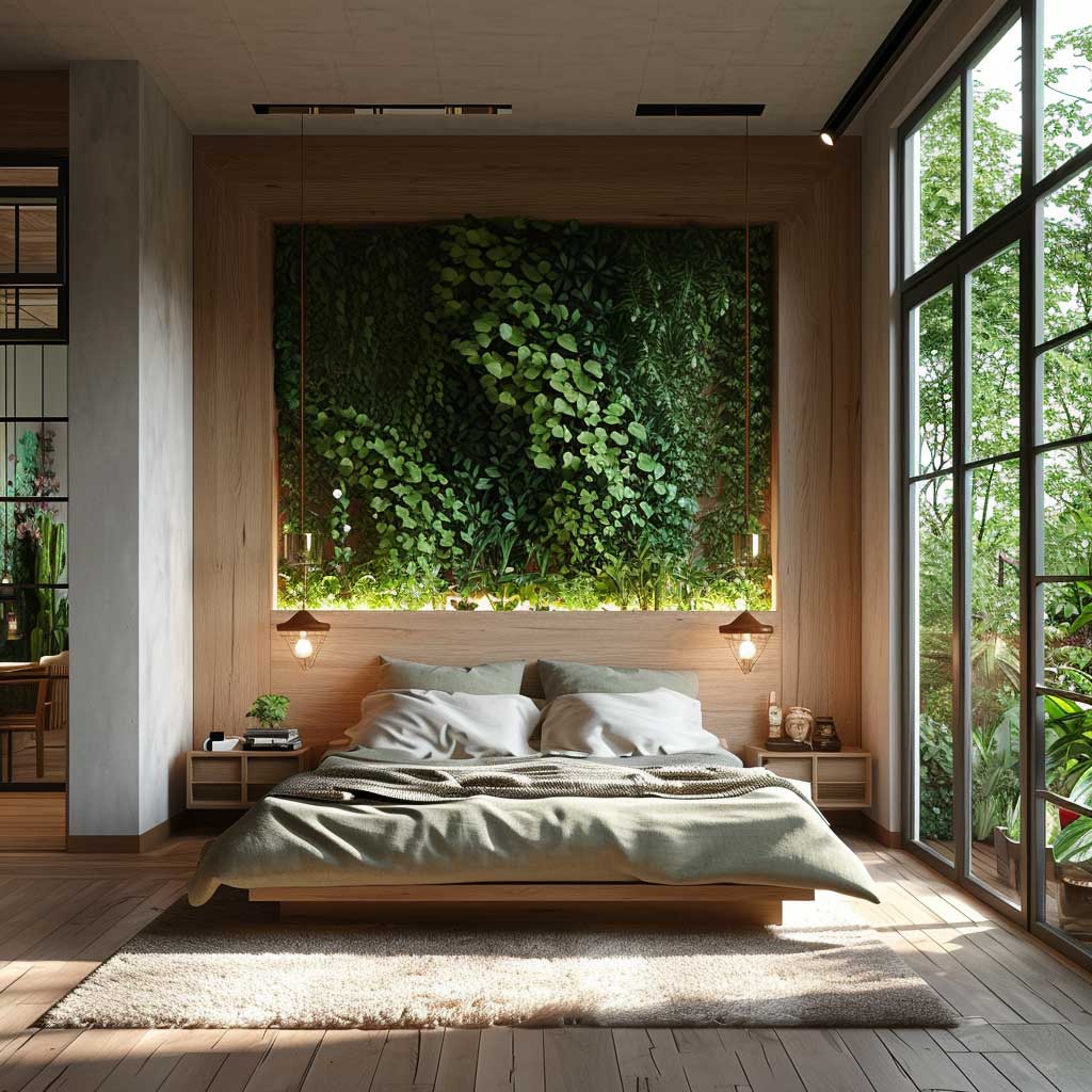 Biophilic design elements are integral to these bedrooms, bringing the outside world into the space. This could be in the form of living walls, which not only purify the air but also provide a living piece of art, or the use of plant installations that add a natural touch. The presence of these elements has been shown to reduce stress and improve overall well-being, making them a perfect fit for a restful bedroom environment.