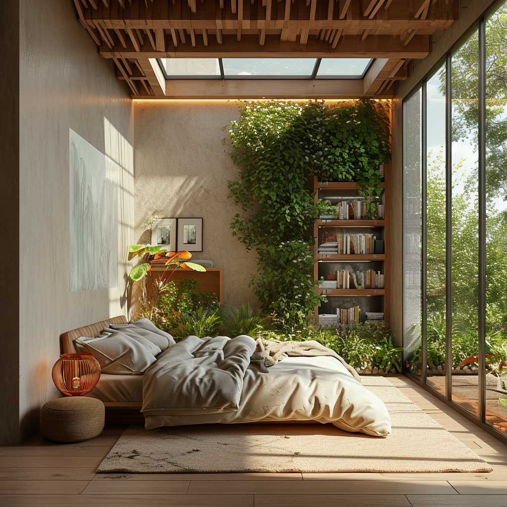 Central to the eco-friendly new age interior bedroom is the use of sustainable materials. Furniture made from reclaimed wood, organic fabrics, and recycled materials are not only environmentally friendly but also add a unique aesthetic to the room. These materials are selected for their minimal environmental footprint and their ability to create a warm and inviting ambiance.