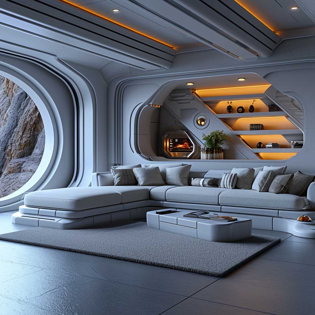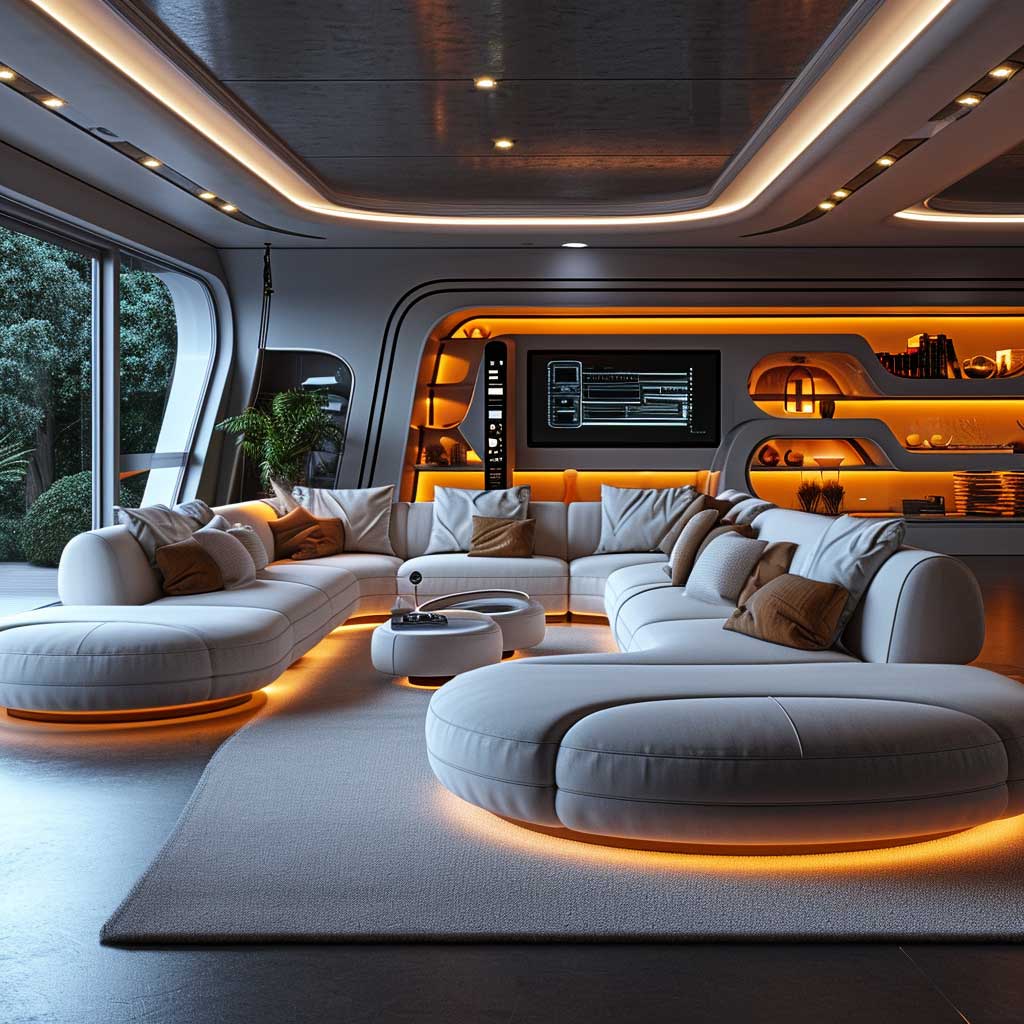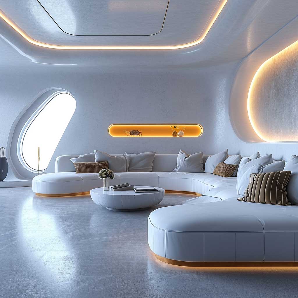 The lighting in these spaces is carefully curated to enhance the mood and ambiance. LED lights that can change color and intensity based on the time of day or the desired atmosphere are common. Artistic light fixtures serve as focal points, adding to the room’s futuristic feel.