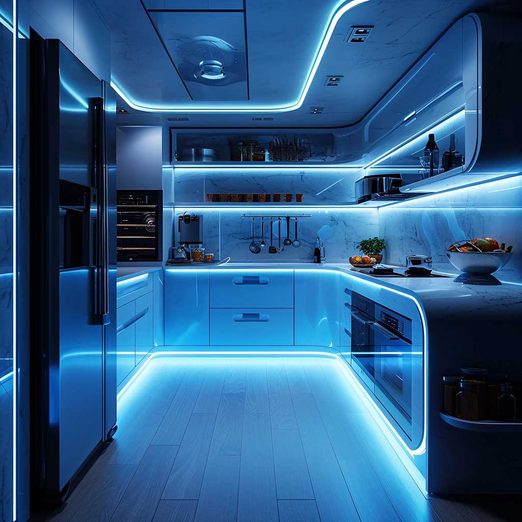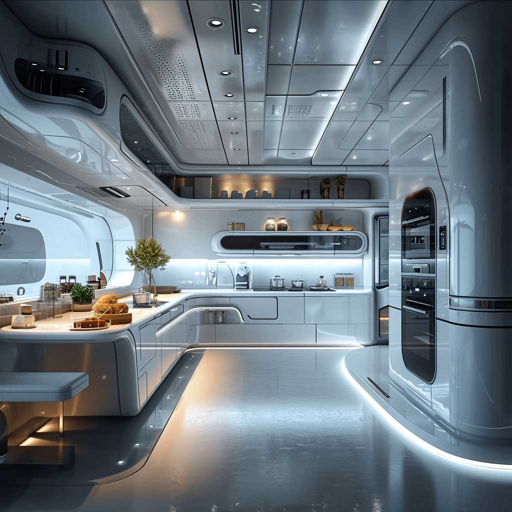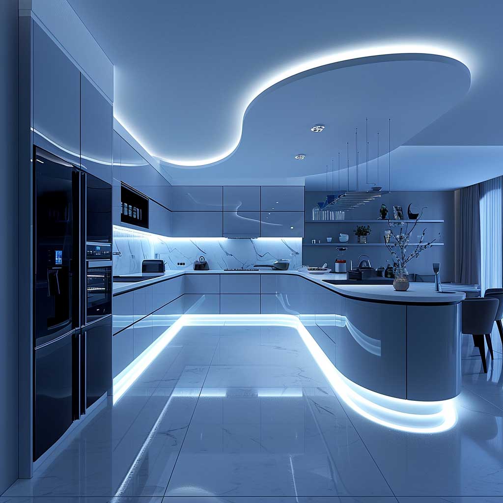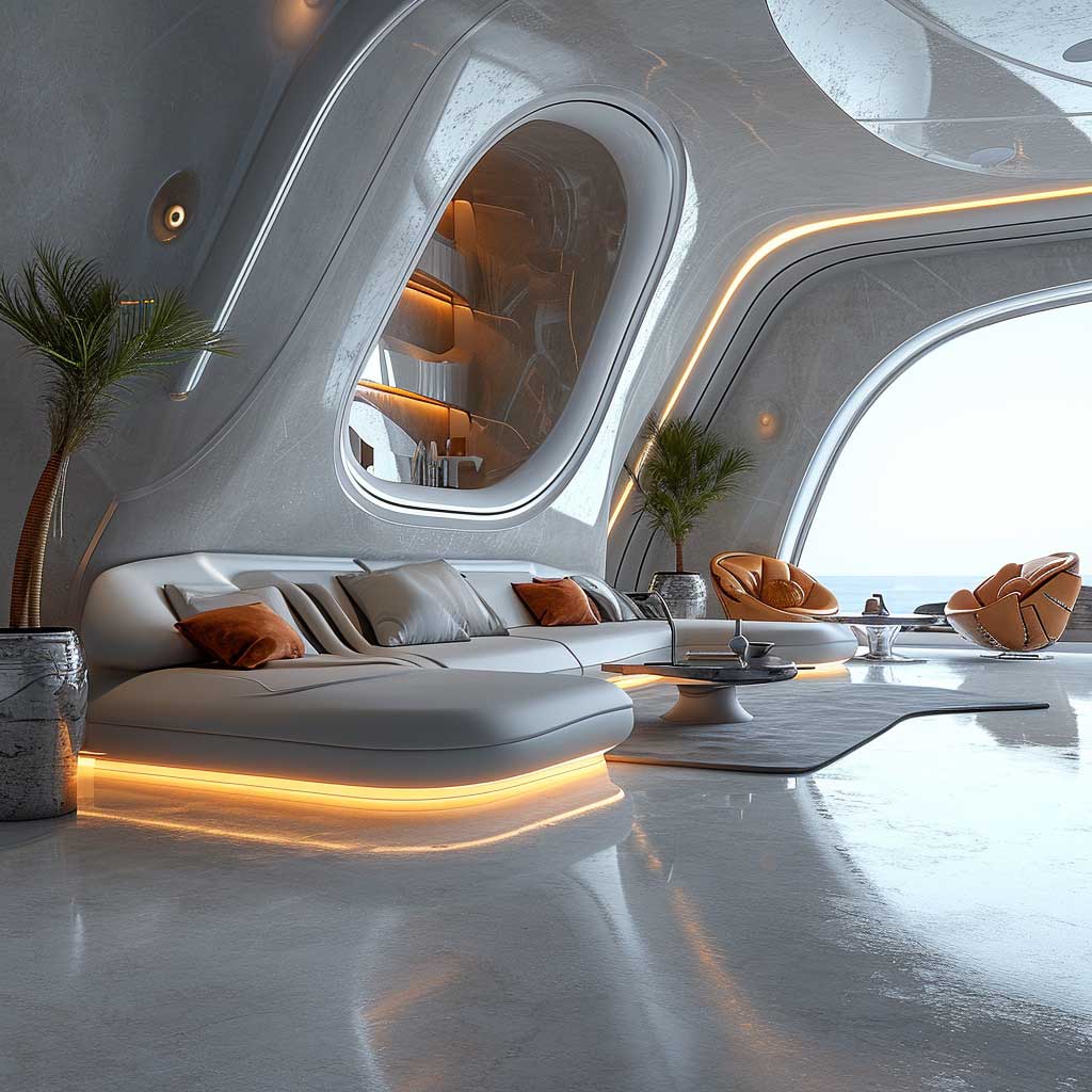 The lighting in these spaces is carefully curated to enhance the mood and ambiance. LED lights that can change color and intensity based on the time of day or the desired atmosphere are common. Artistic light fixtures serve as focal points, adding to the room’s futuristic feel.