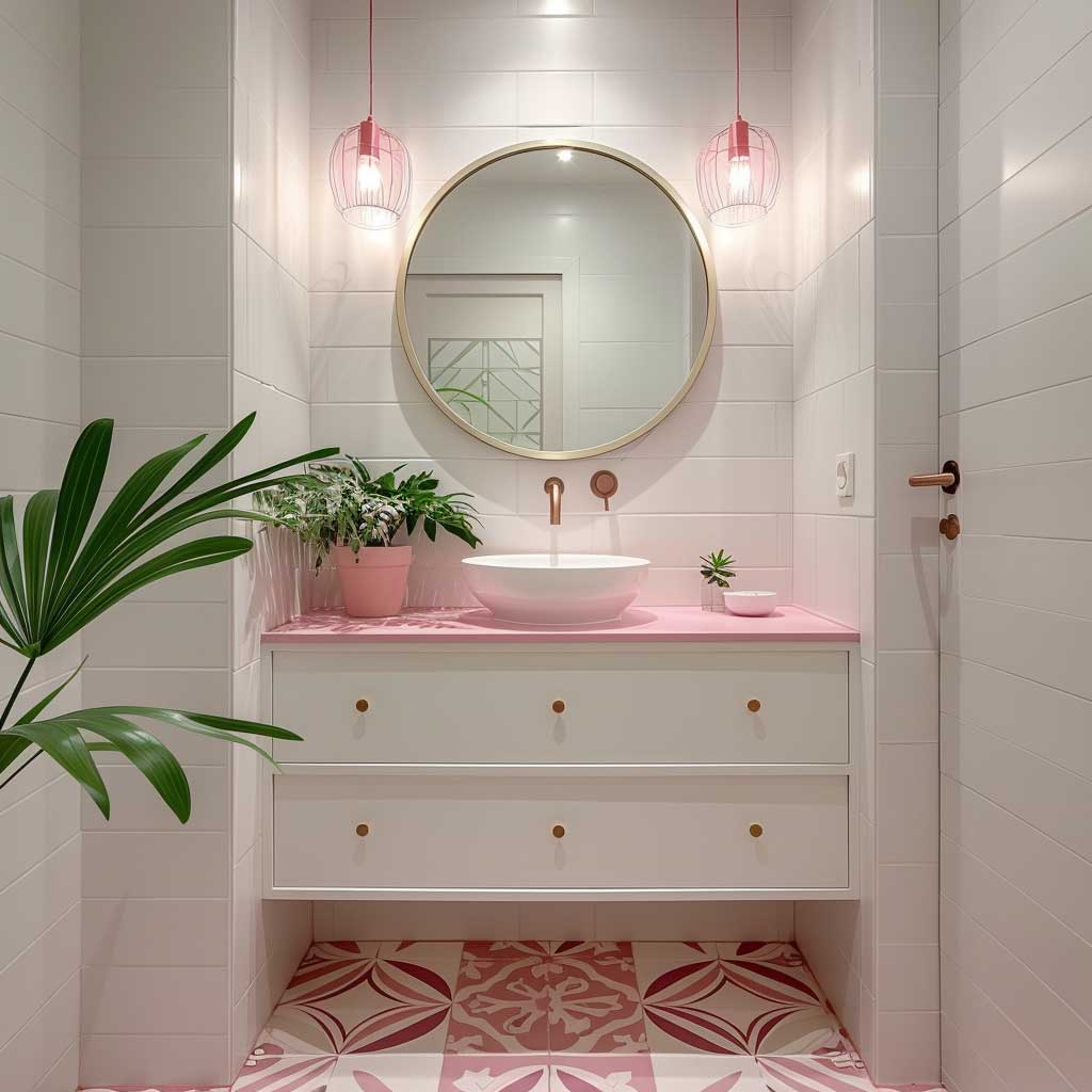 Integrating pink and white patterns into a small bathroom is an excellent way to add visual interest and a playful vibe. Geometric floor tiles in pink and white can create a dynamic and lively atmosphere, making the bathroom feel more engaging and fun. The use of patterns adds depth and dimension to the space, which is particularly beneficial in a small bathroom.