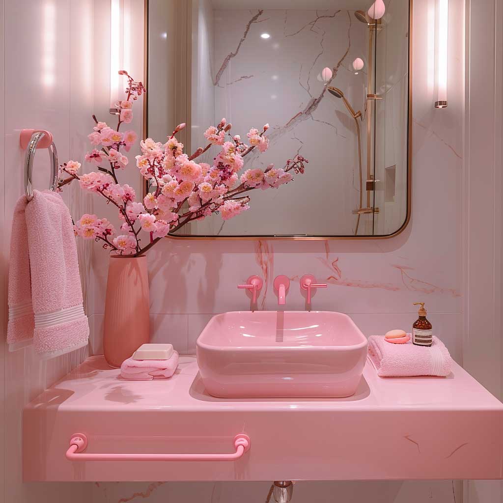 To soften the boldness of the pink fixtures, a small vase with fresh flowers can add a natural and organic touch. The flowers introduce a bit of nature into the space, enhancing the overall design and adding a layer of freshness and vitality.