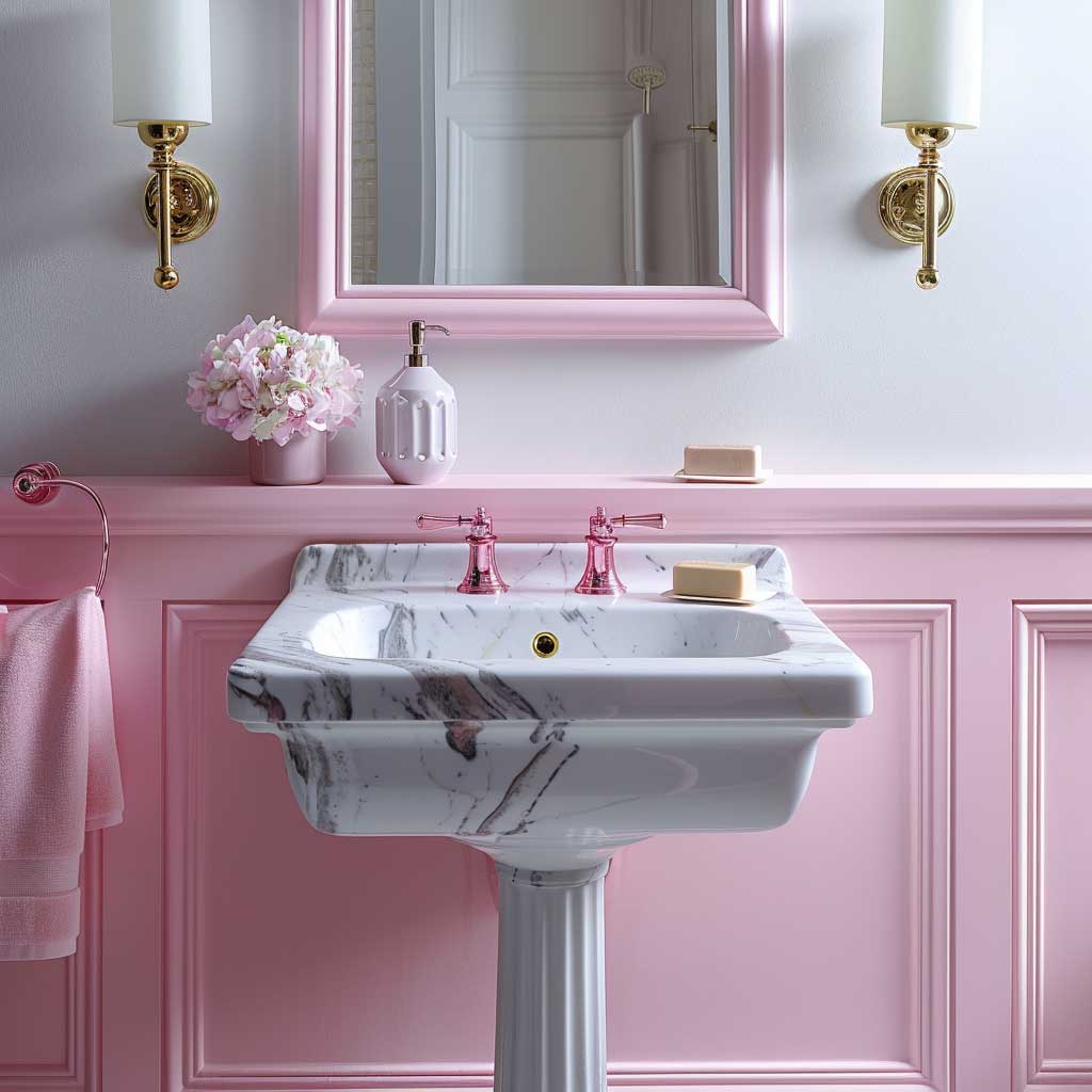 A pink sink is a bold choice that instantly becomes the centerpiece of the bathroom. Paired with white walls and marble accents, the pink sink adds a vibrant pop of color while maintaining a sense of elegance. The contrast between the pink sink and the white and marble surroundings creates a balanced and harmonious look.