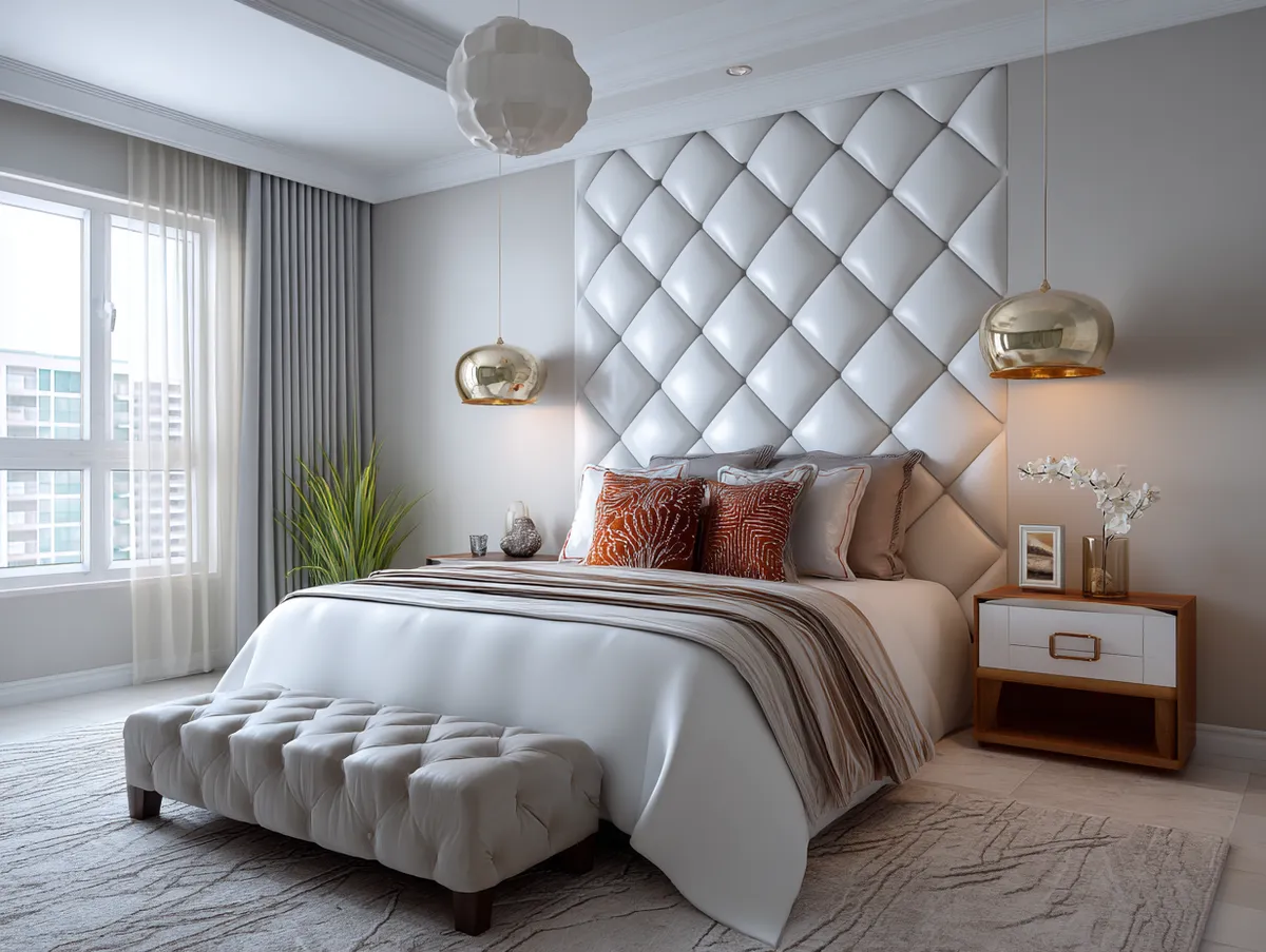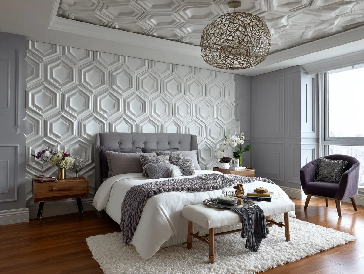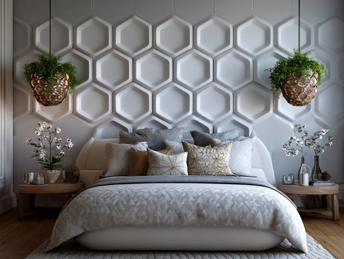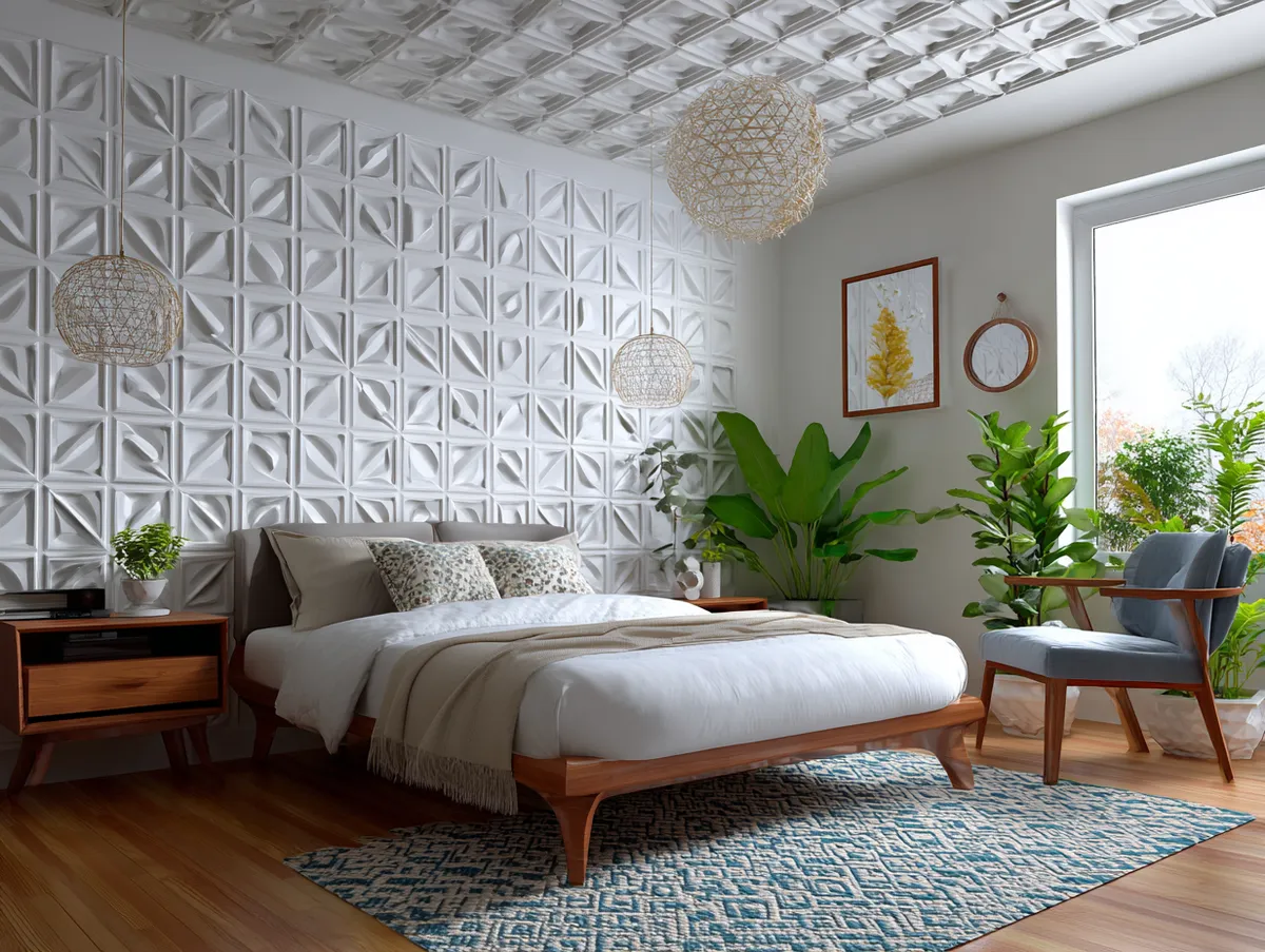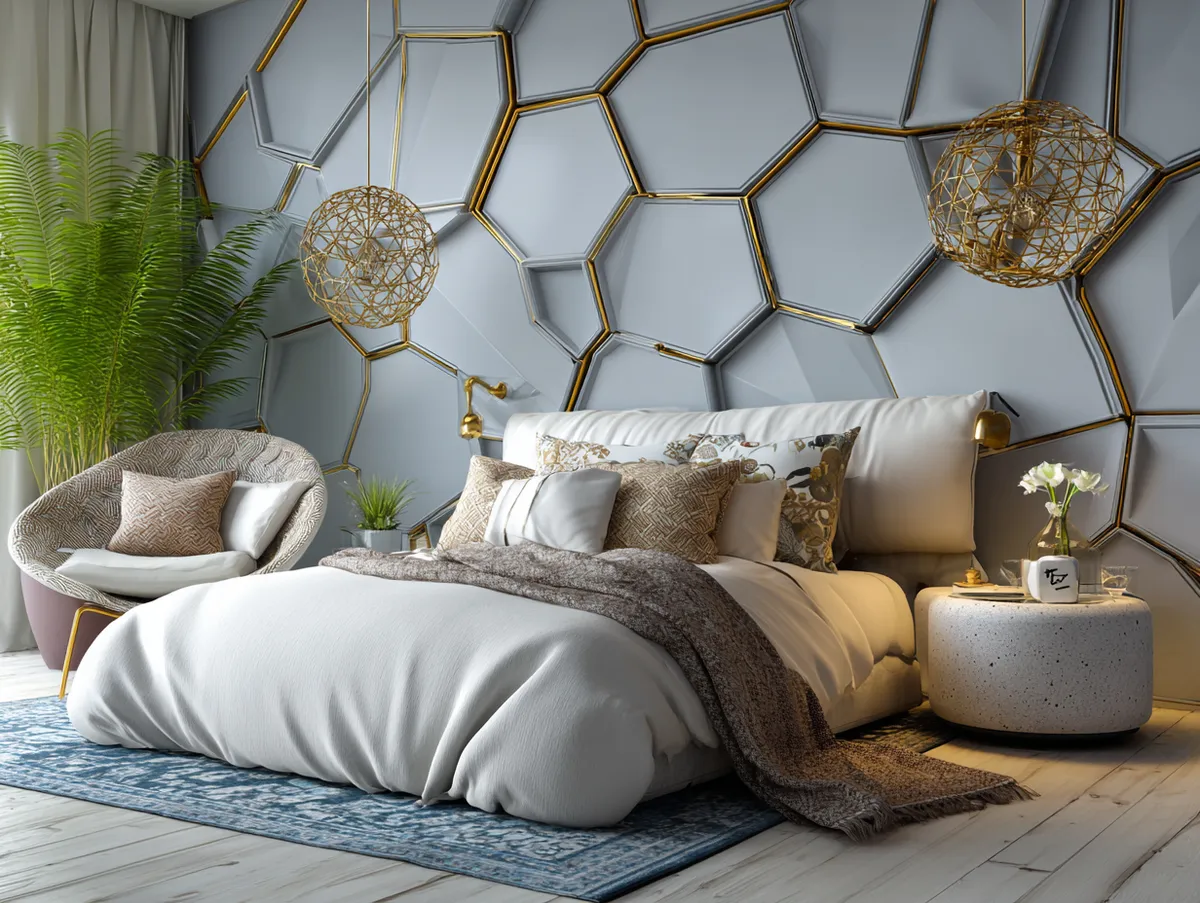 PVC panels are known for their versatility and can be customized to fit various design preferences. In this case, the geometric patterns add a dynamic visual element that makes the bedroom more interesting.