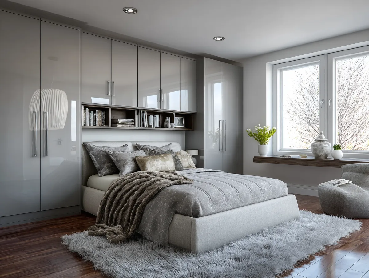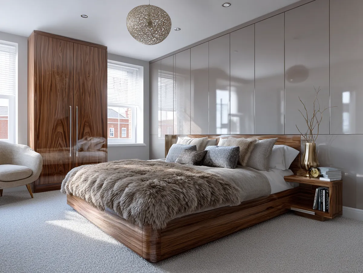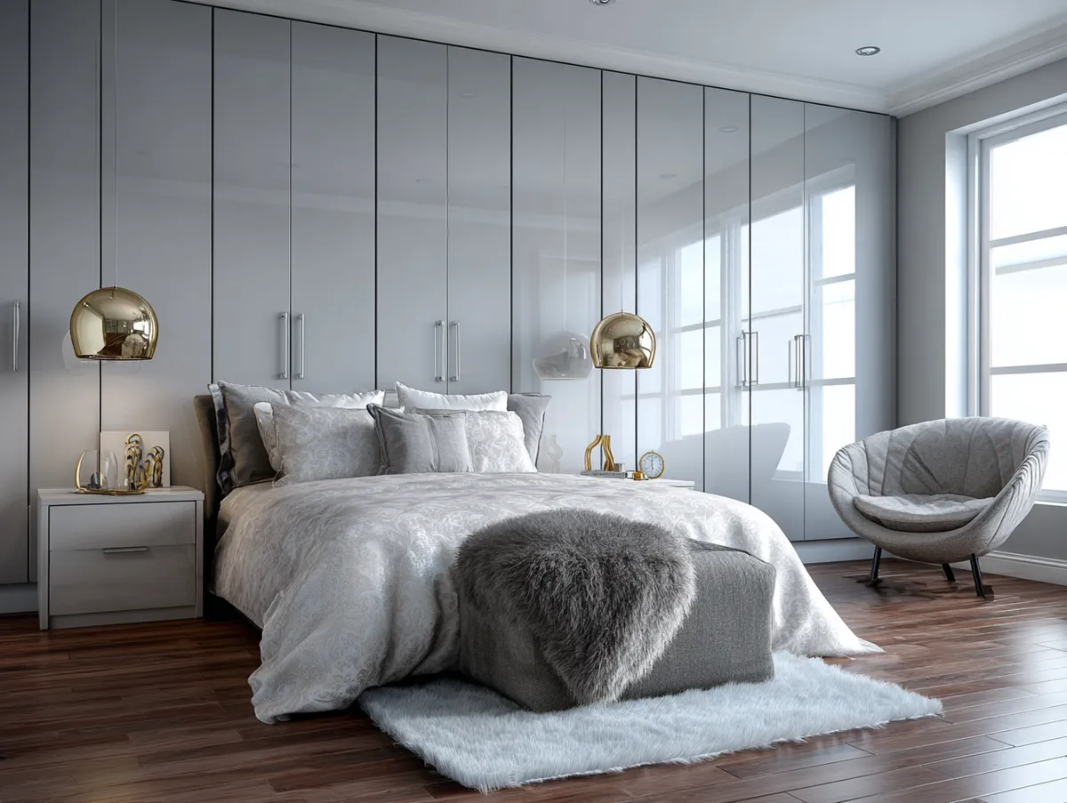 As seen in the photo, the glossy finish of the panels pairs well with different materials. The contrast between the glossy panels and the matte bed linen adds interest to the room and prevents it from looking flat.