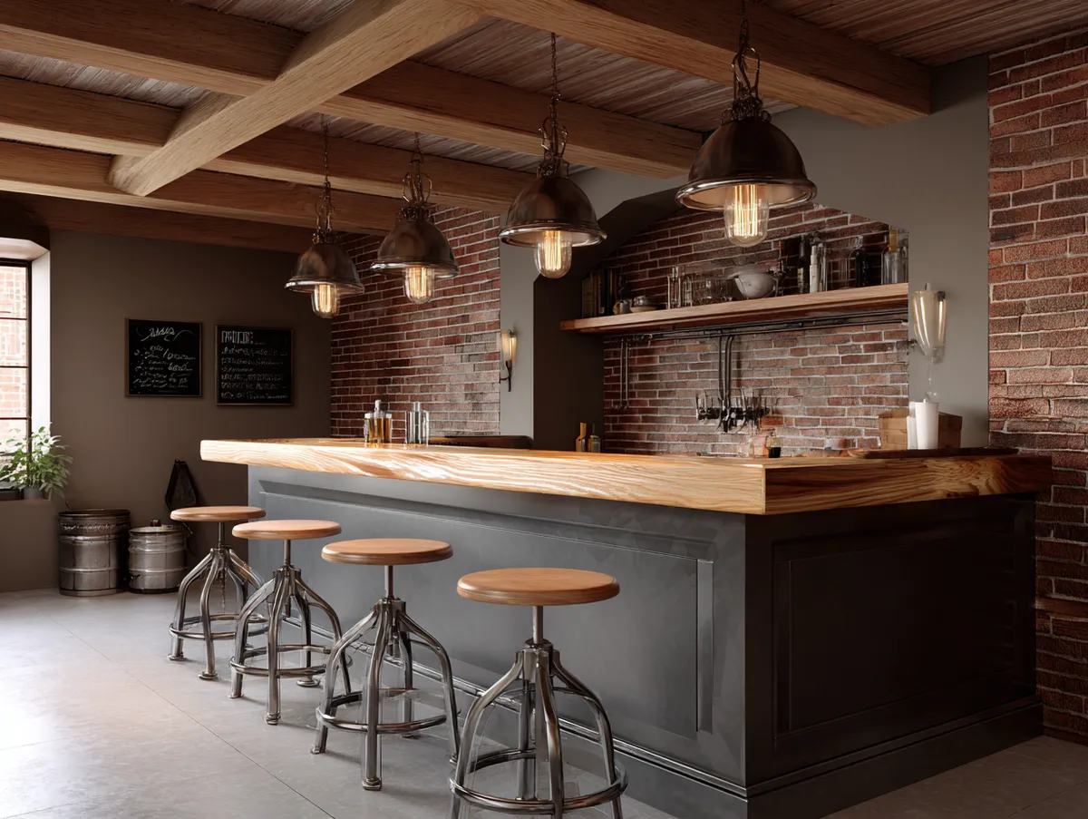 Lighting plays a crucial role in setting the mood of a bar. In the photo, warm pendant lights hang above the bar, casting a soft, inviting glow. These lights accentuate the textures of the wood and brick, further enhancing the rustic feel.