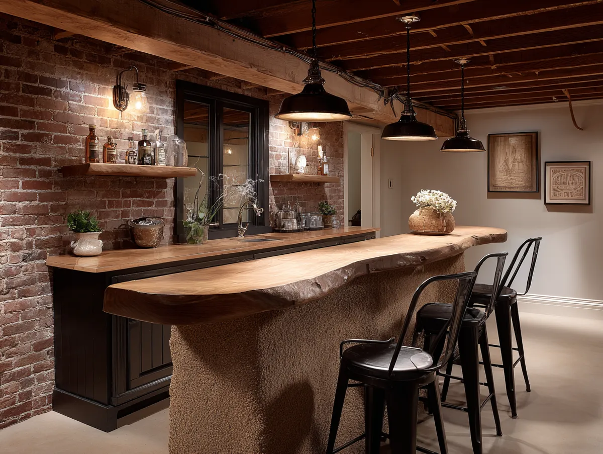 The third photo showcases a fun and functional rustic basement idea: a basement bar. A bar can serve as a great entertainment area, perfect for hosting parties or enjoying a quiet evening at home.