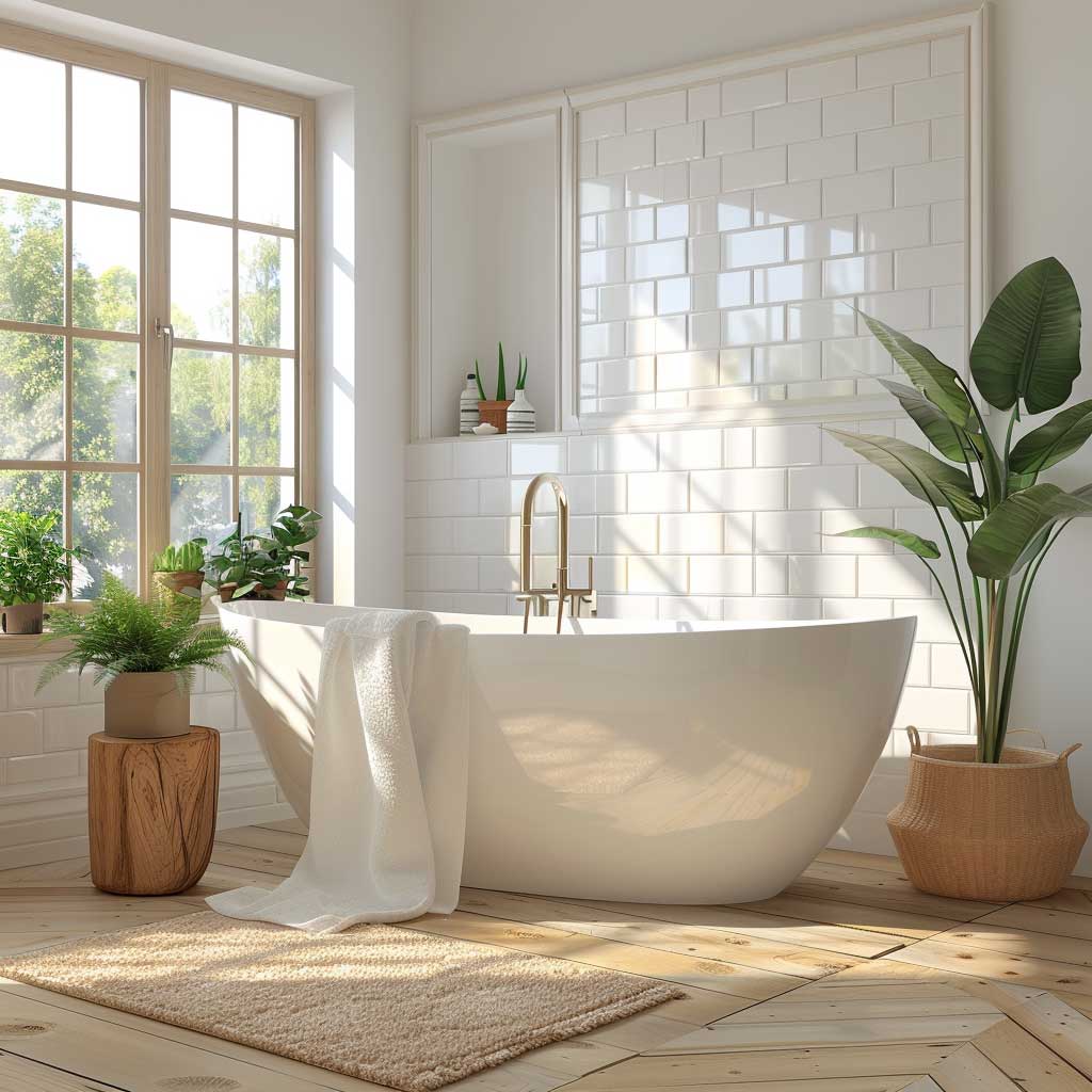 An elegant freestanding tub is a centerpiece in any Scandinavian bathroom, combining functionality with luxurious comfort. Its clean lines and matte white finish exemplify the minimalist design principles of Scandinavian interiors, creating a sense of simplicity and elegance. The modern fixtures further enhance the tub’s sleek appearance, adding a touch of sophistication to the space.