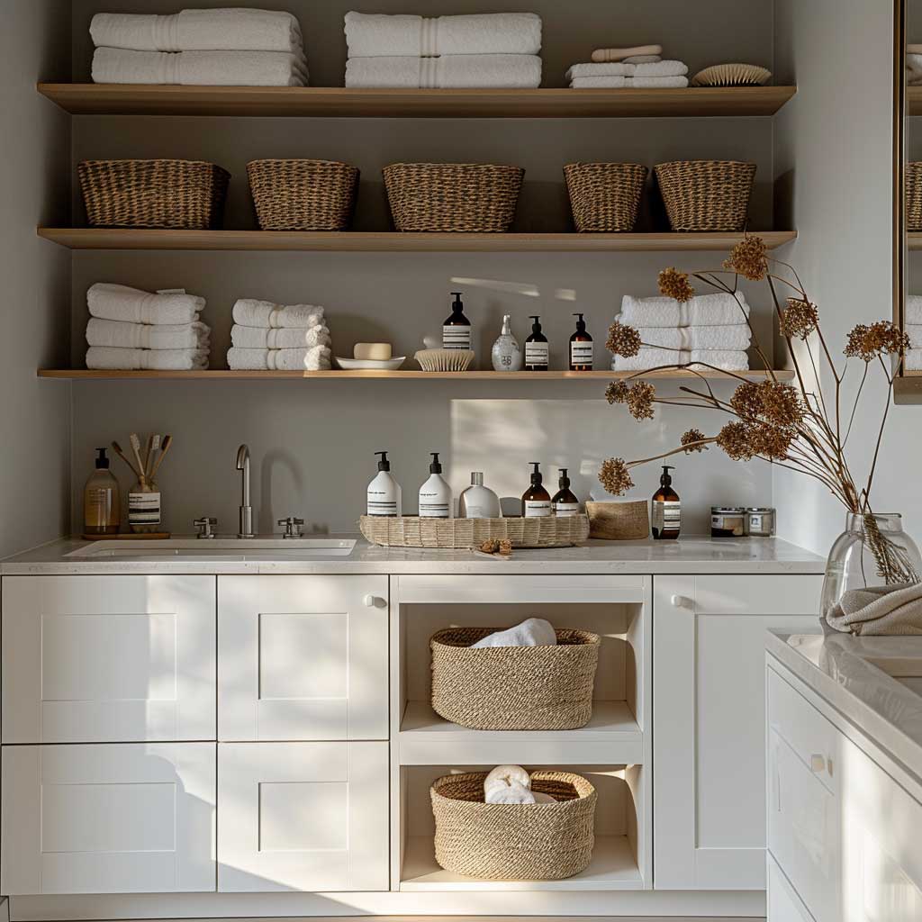 Effective storage solutions are essential in maintaining a clean and organized bathroom, especially when adhering to Scandinavian design principles. Minimalist storage options not only help keep your space tidy but also enhance its overall aesthetic. Sleek white cabinets are a staple in Scandinavian interiors, offering ample storage without overpowering the room’s design. These cabinets blend seamlessly with light grey walls, creating a harmonious and serene environment.