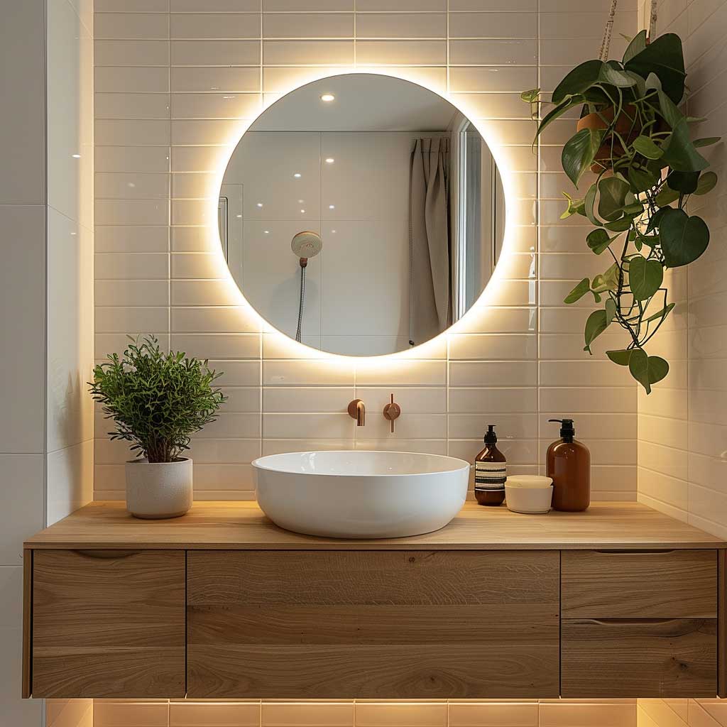 Soft ambient lighting is crucial in achieving the cozy, inviting atmosphere characteristic of hygge. Consider installing wall sconces or pendant lights with warm bulbs to cast a gentle glow across the room. The white tiled wall behind the vanity further amplifies the light, contributing to an airy and bright environment. This combination of elements not only makes your bathroom more functional but also transforms it into a relaxing retreat where you can unwind and rejuvenate.