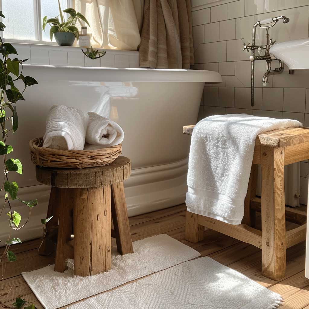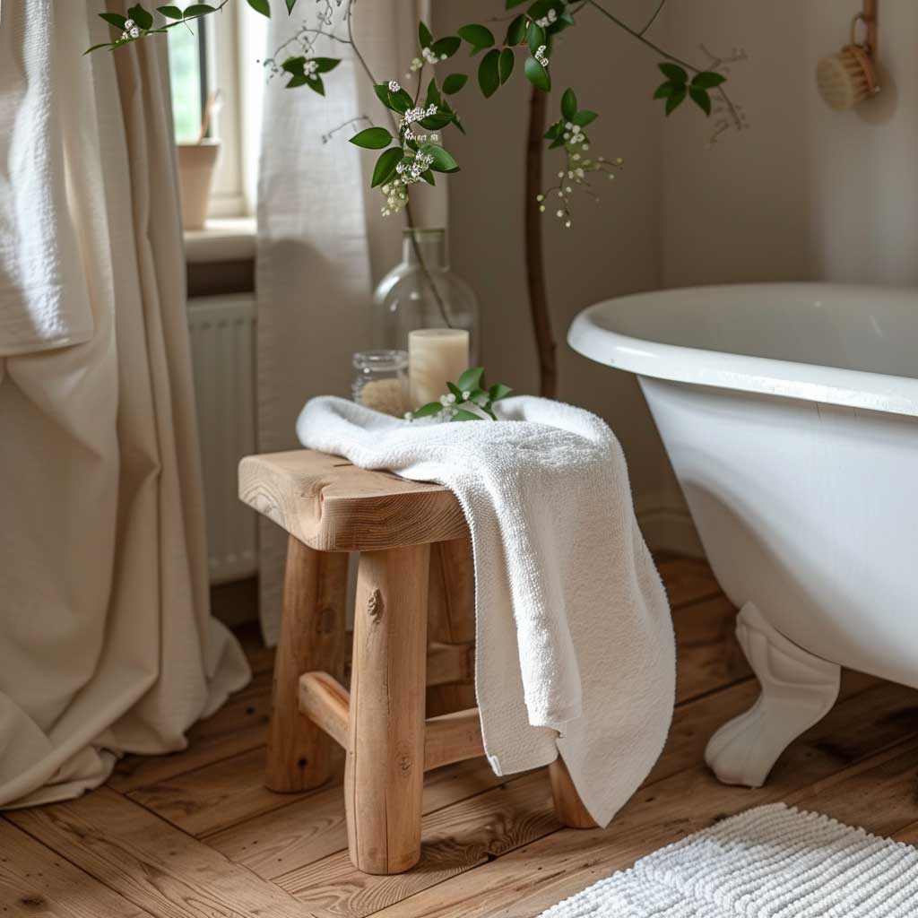 To enhance the hygge atmosphere, surround the stool with soft white towels and a few touches of greenery. Plants such as ferns or succulents add a refreshing burst of life and color, contributing to the room’s overall sense of tranquility and relaxation. Muted tones in the surrounding decor, such as beige or light gray, complement the stool’s natural wood, creating a cohesive and inviting space.