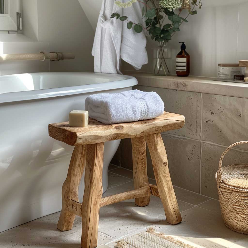 A wooden stool is not only an attractive addition but also serves multiple purposes. Place it next to a freestanding bathtub to hold towels, bath products, or even a glass of wine while you soak. It can also function as a small table or additional seating, offering flexibility in how you use your bathroom.