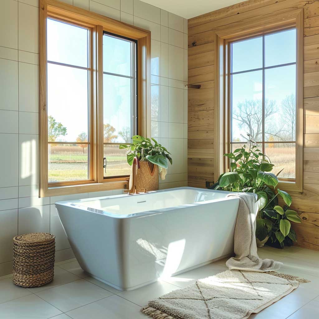 Lush green plants around the tub add a refreshing touch of nature, further enhancing the bathroom’s serene ambiance. Plants such as ferns, peace lilies, or even a small indoor tree can thrive in the humid bathroom environment, bringing life and color to the space. The combination of these elements creates a luxurious and calming retreat, perfect for unwinding after a long day.