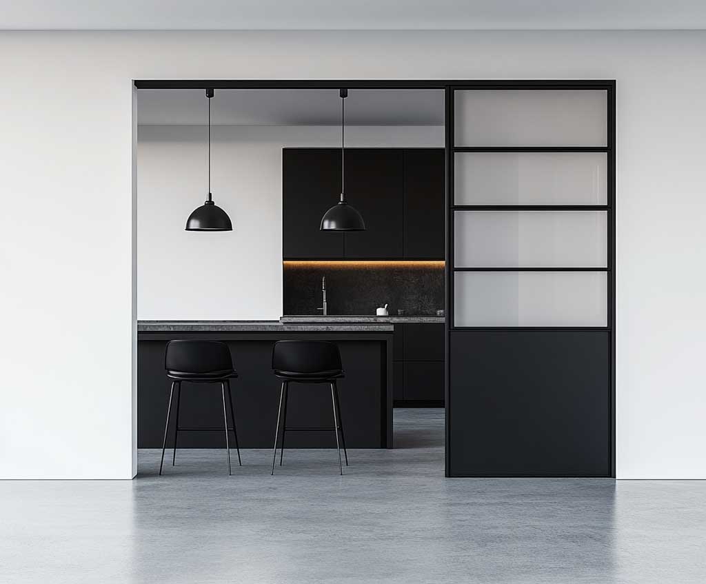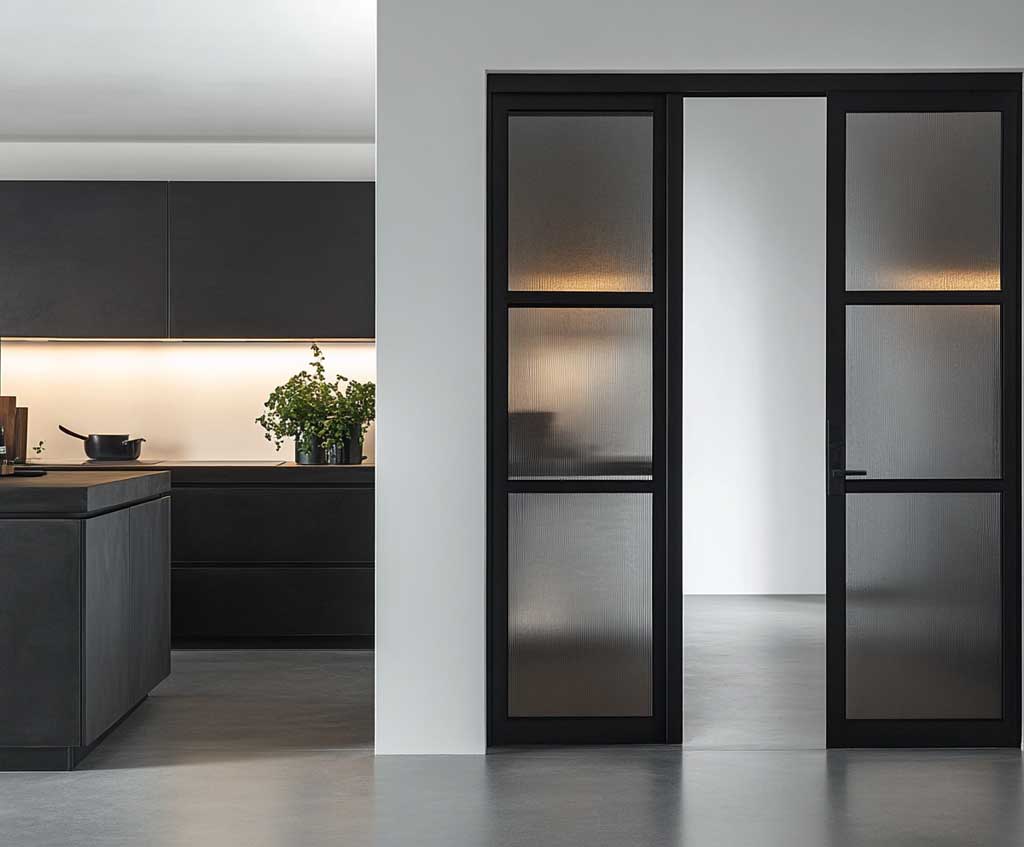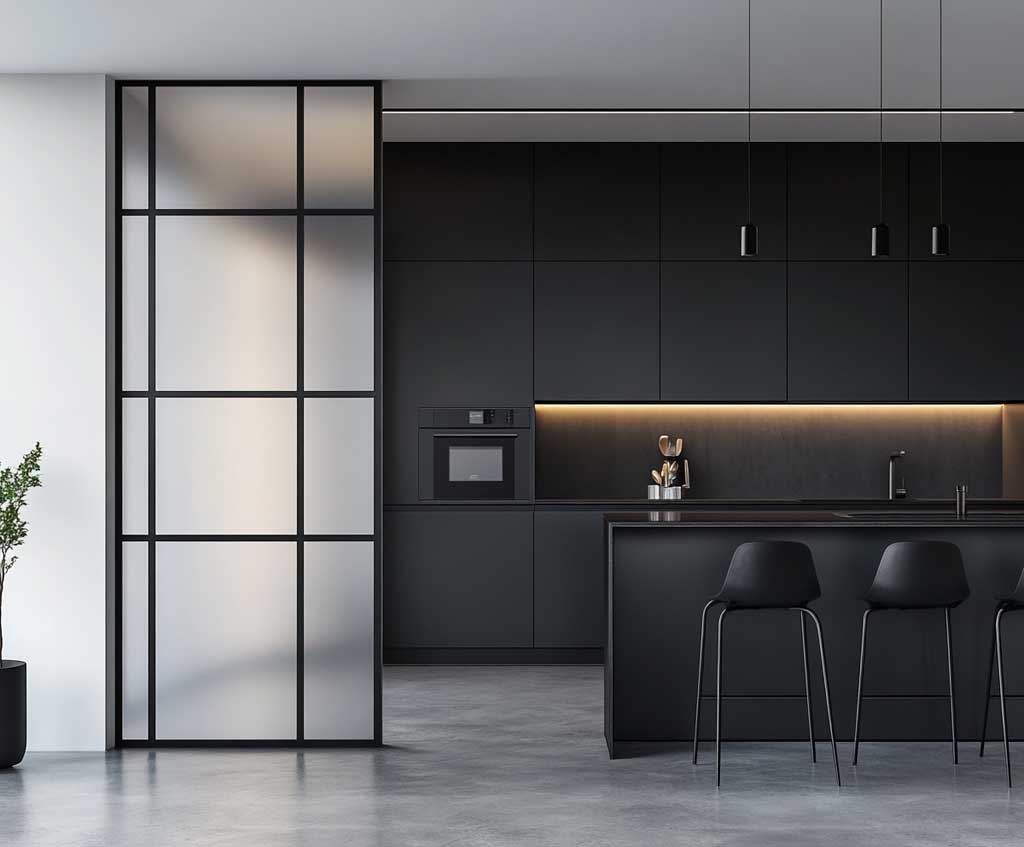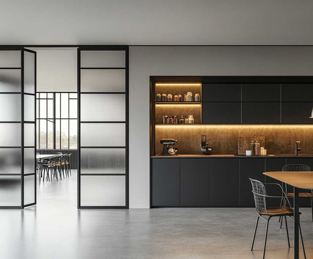In minimalist design, it’s essential to focus on simplicity and efficiency. A metal kitchen door perfectly complements this approach by providing durability and functionality without unnecessary embellishment. The combination of metal and frosted glass offers privacy while still allowing light to filter through, maintaining the airy and open atmosphere characteristic of minimalist kitchens. The frosted glass, in particular, adds a soft texture to the door, breaking up the starkness of the black metal and bringing a subtle warmth to the design.