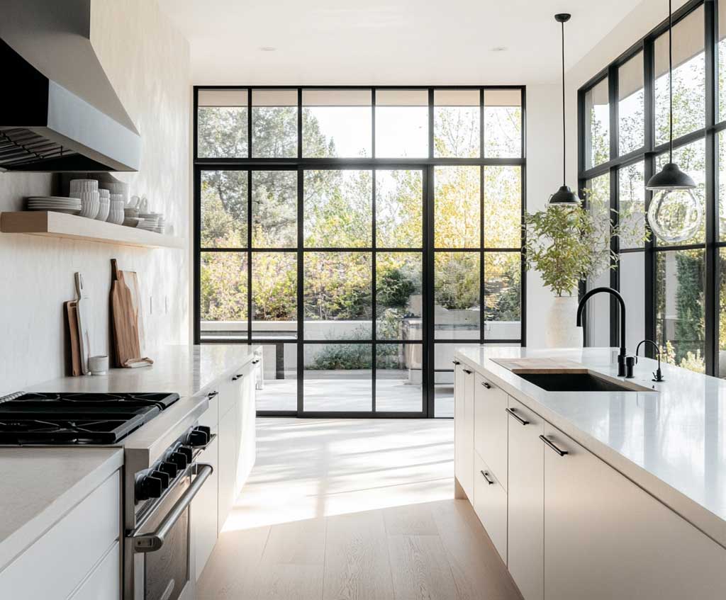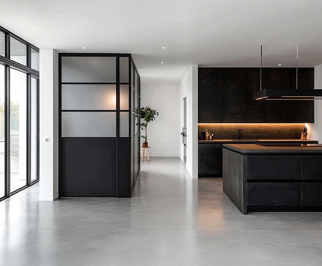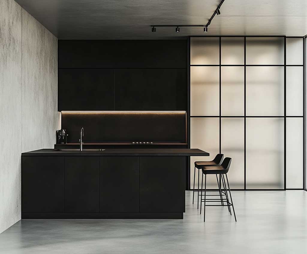 A sleek black metal door creates an undeniable focal point, especially in spaces where the color palette is mostly neutral or white. It acts as an anchor, grounding the kitchen’s design and providing a bold contrast that draws the eye. For homeowners who prefer a minimalist aesthetic but still want to make a statement, a black metal door offers the perfect balance of simplicity and boldness. Its strong visual impact does not detract from the rest of the space but rather enhances the overall modern feel of the kitchen.
