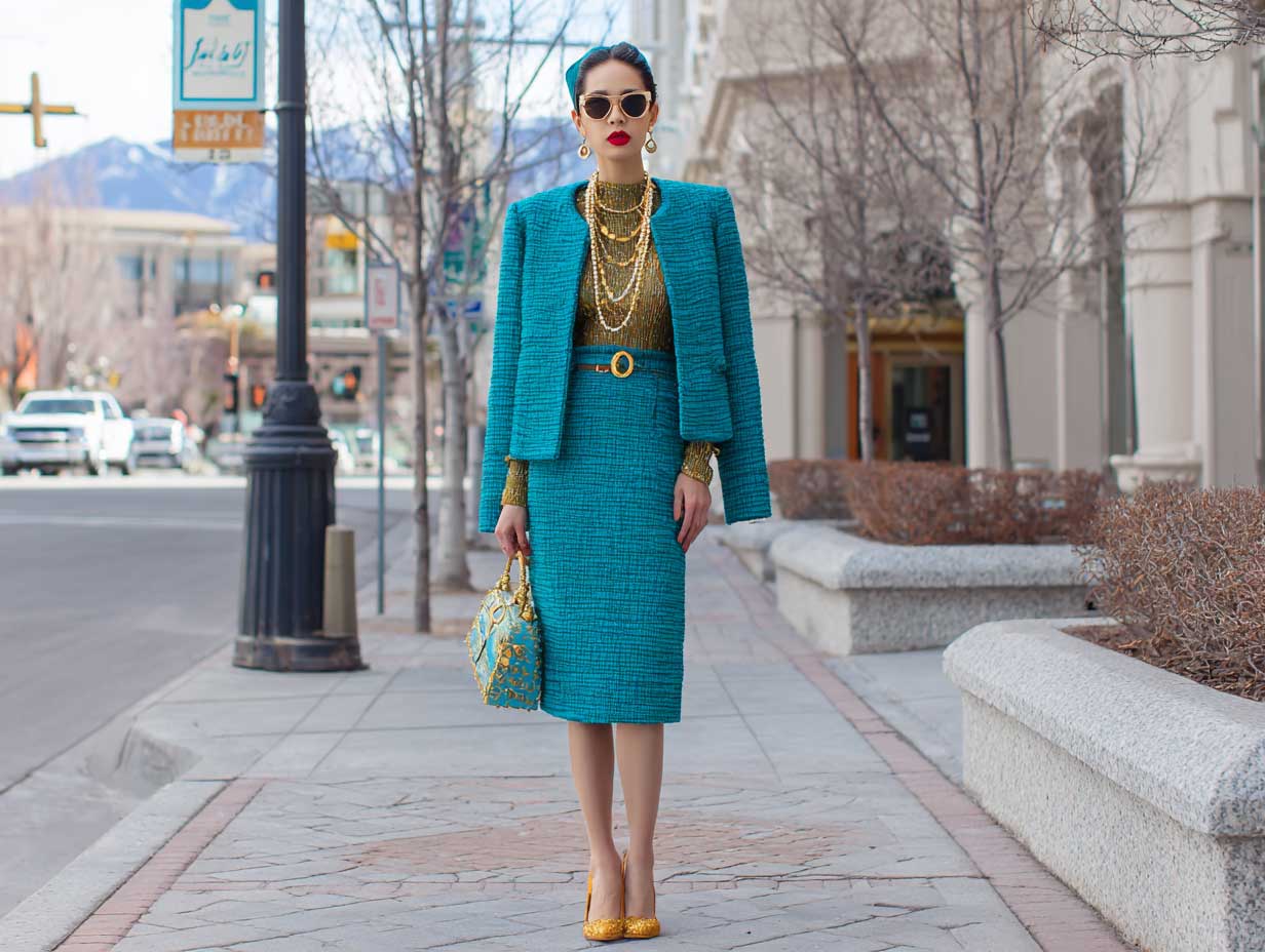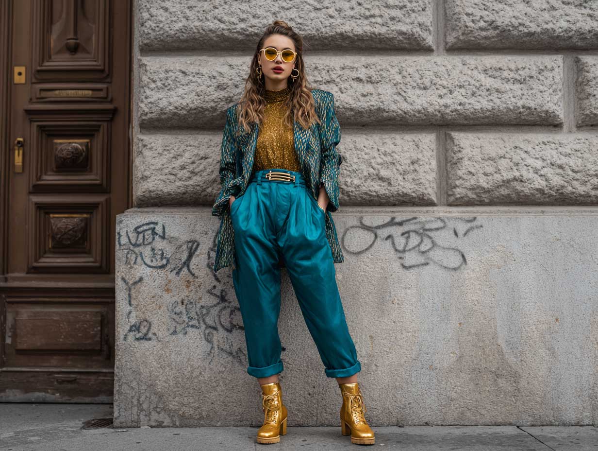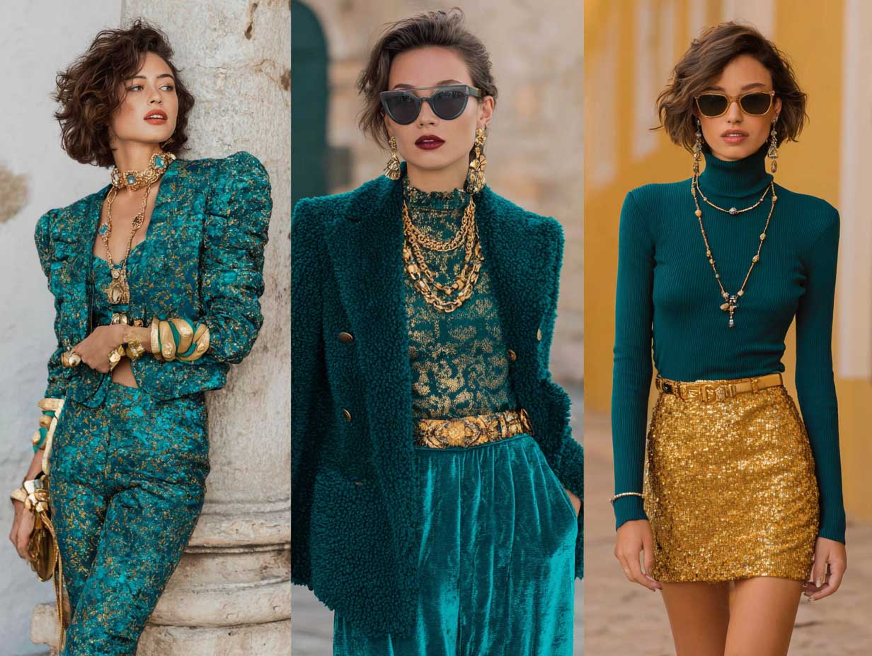 In the minimalist setting, the richness of the teal and gold combination is allowed to shine, with the simple background emphasizing the outfit’s luxurious textures and vibrant colors. This look is ideal for those who want to incorporate the bold, sophisticated style of the 90s into their modern wardrobe.