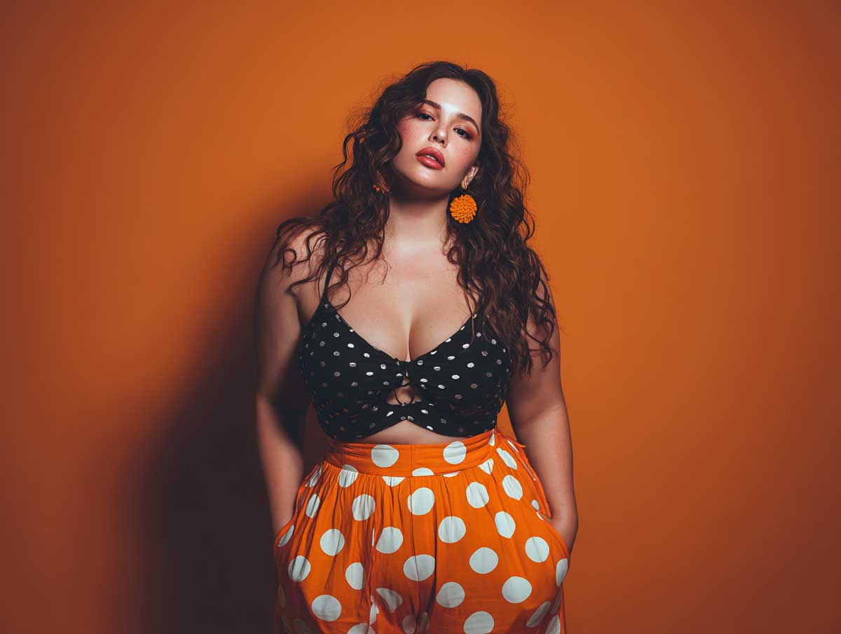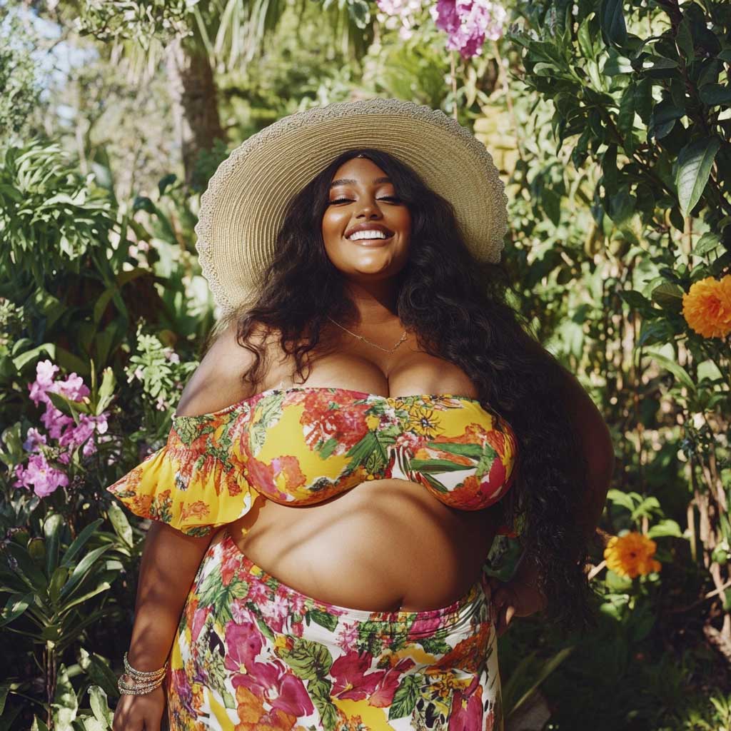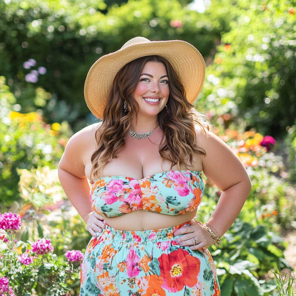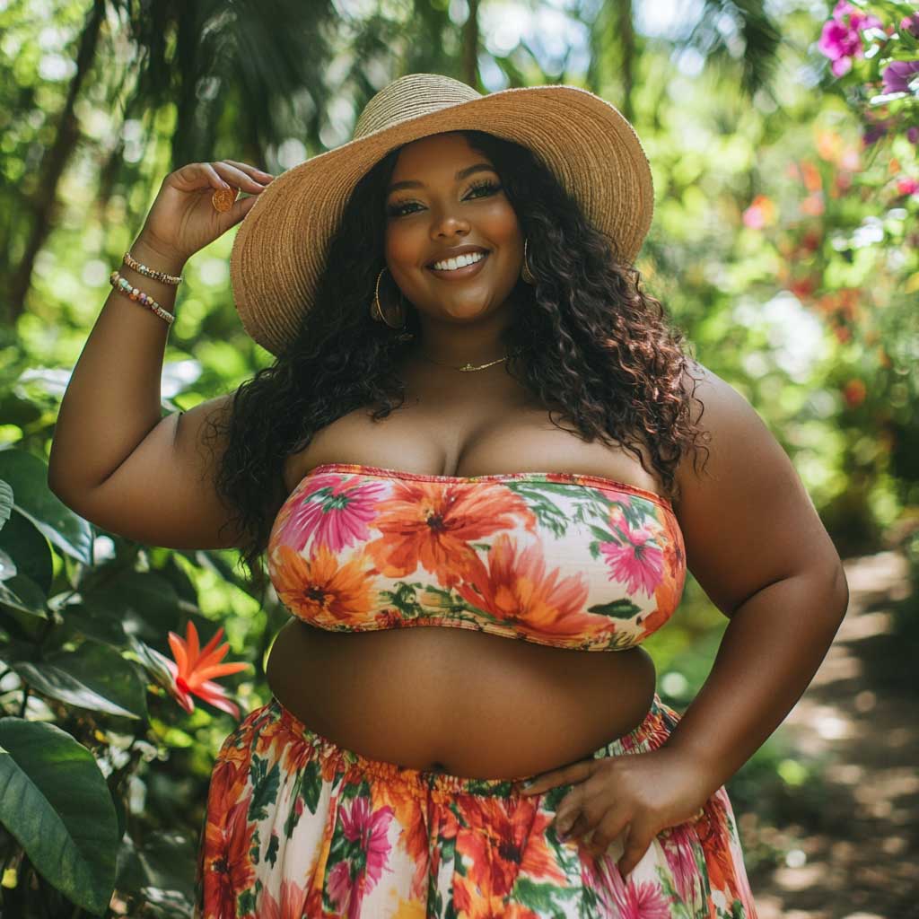 This outfit is all about celebrating summer with style and confidence. The floral print crop top, combined with a flowy midi skirt, creates a look that is both comfortable and striking. It’s the perfect choice for plus-size ladies who want to embrace their curves and enjoy the season in a fashionable, fun, and bold way.