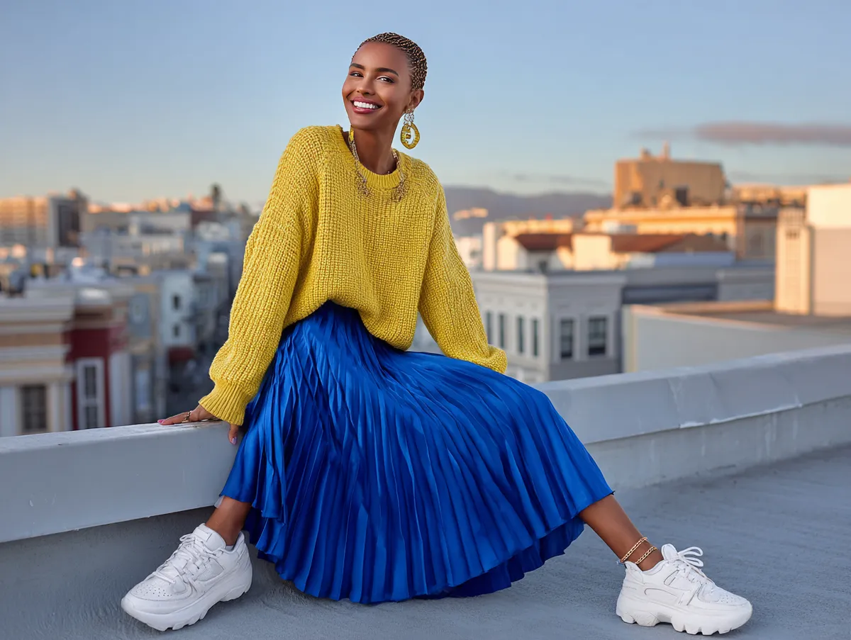 The yellow oversized sweater should have exaggerated sleeves or textured knit details, creating a cozy yet bold statement. Tucking the sweater slightly into the waistband of the royal blue pleated skirt helps define the silhouette while maintaining a laid-back vibe. The skirt should flow gracefully, with accordion pleats that add movement and dimension to the outfit.