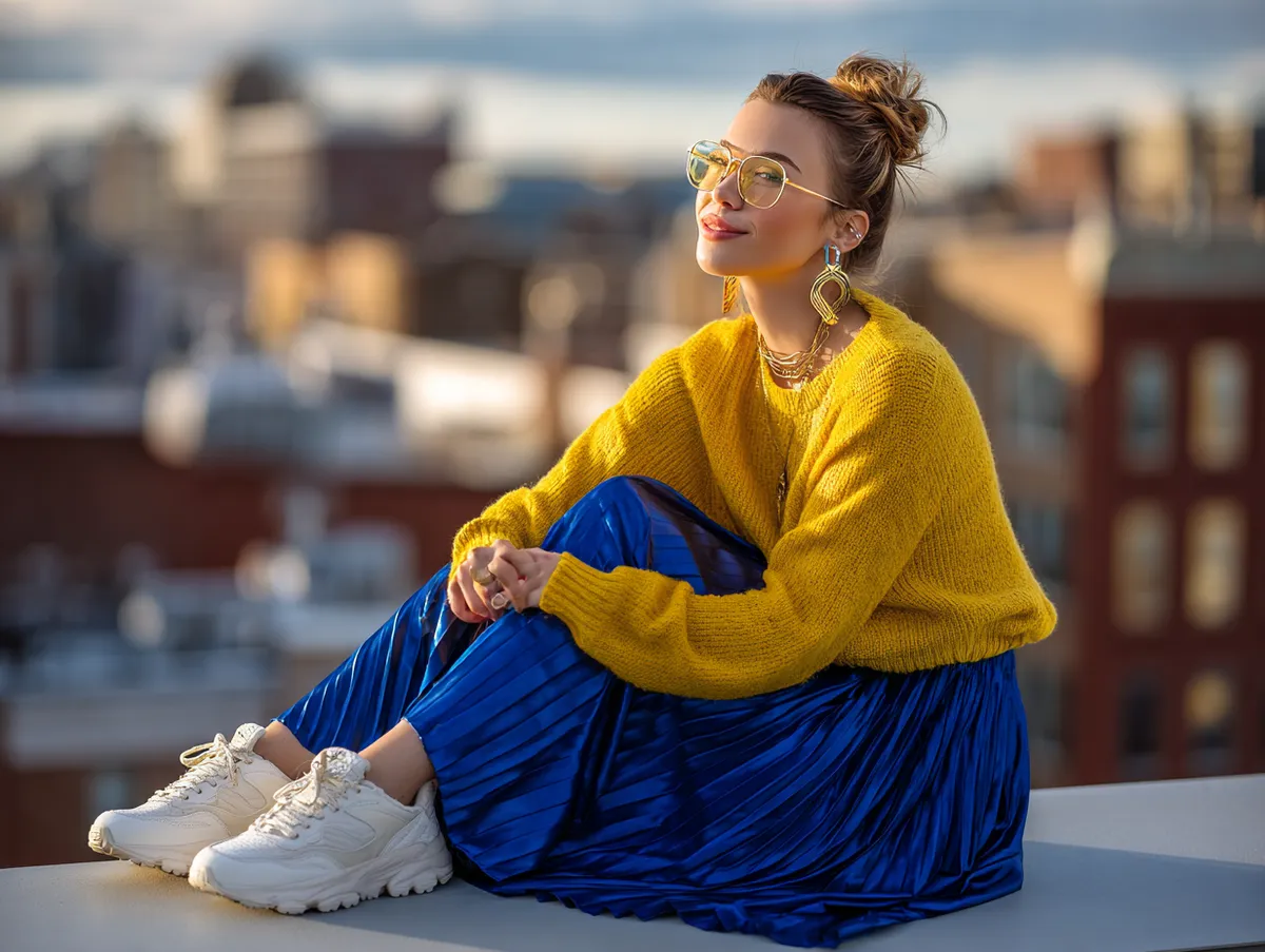 Combining an oversized yellow sweater with a royal blue pleated skirt brings a relaxed yet vibrant energy to retro-inspired fashion. This pairing highlights the playful contrasts of 80s style, balancing casual comfort with refined elegance.