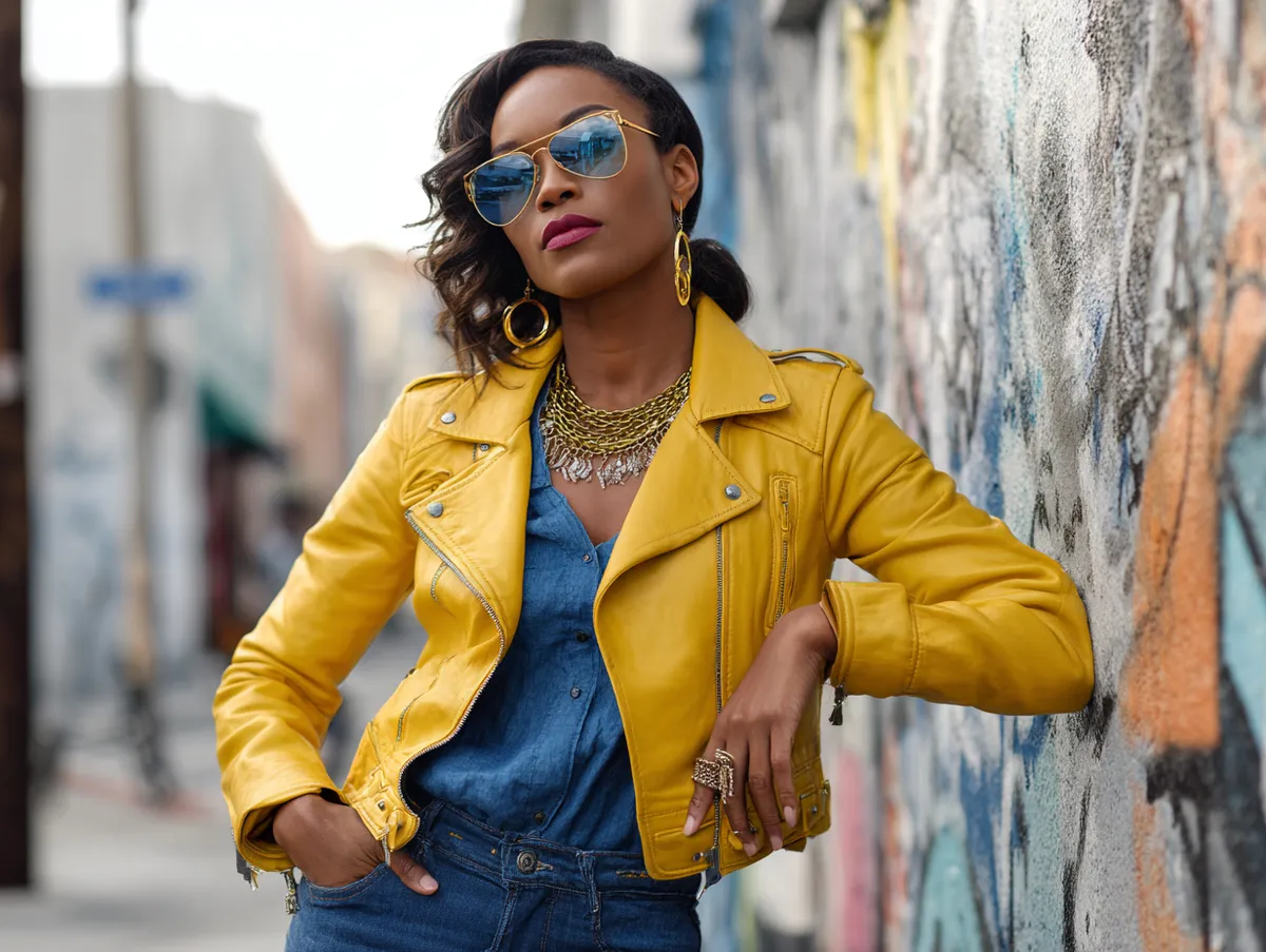 The yellow leather jacket should feature classic biker elements like metallic zippers, wide lapels, and structured shoulders. This bold outerwear acts as the focal point of the outfit, radiating confidence and style. Pair it with royal blue skinny jeans to introduce a striking contrast, balancing the outfit’s proportions and enhancing its visual appeal.