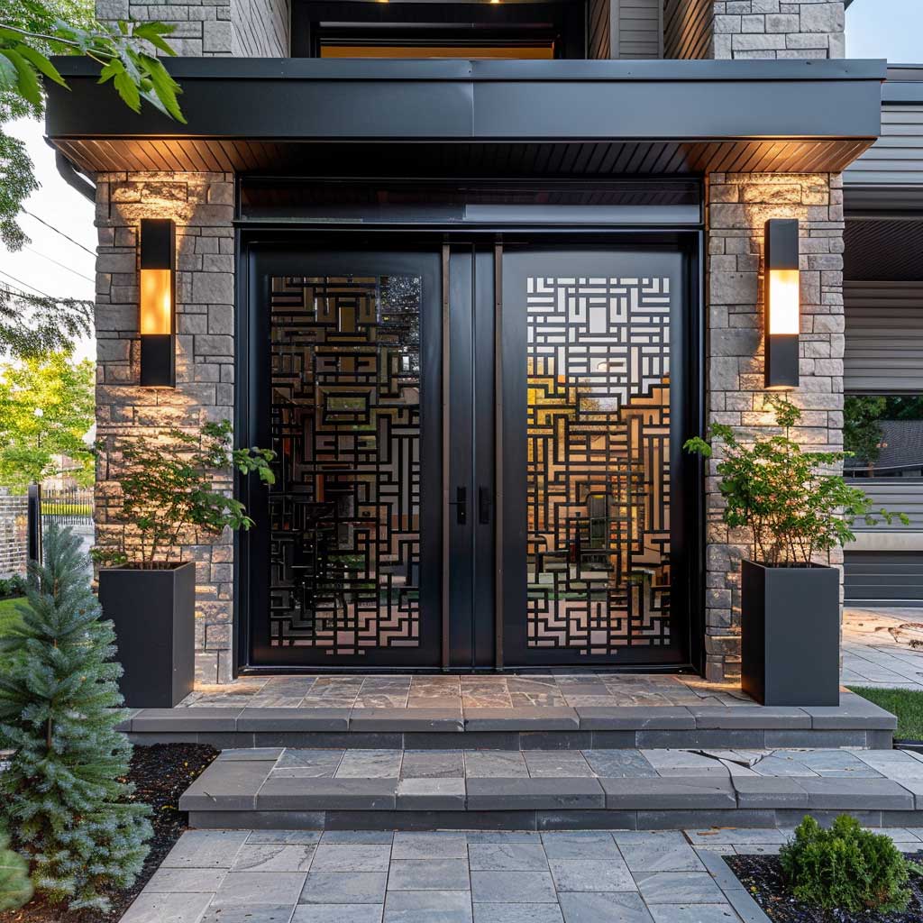 Placed in a contemporary home entrance with sleek lines and minimalistic landscaping, these doors become a focal point. The simplicity of the surrounding elements allows the geometric patterns to stand out, making a bold statement. The iron’s dark, matte finish contrasts beautifully with the clean, white walls and minimalist garden, enhancing the overall aesthetic of the entryway.