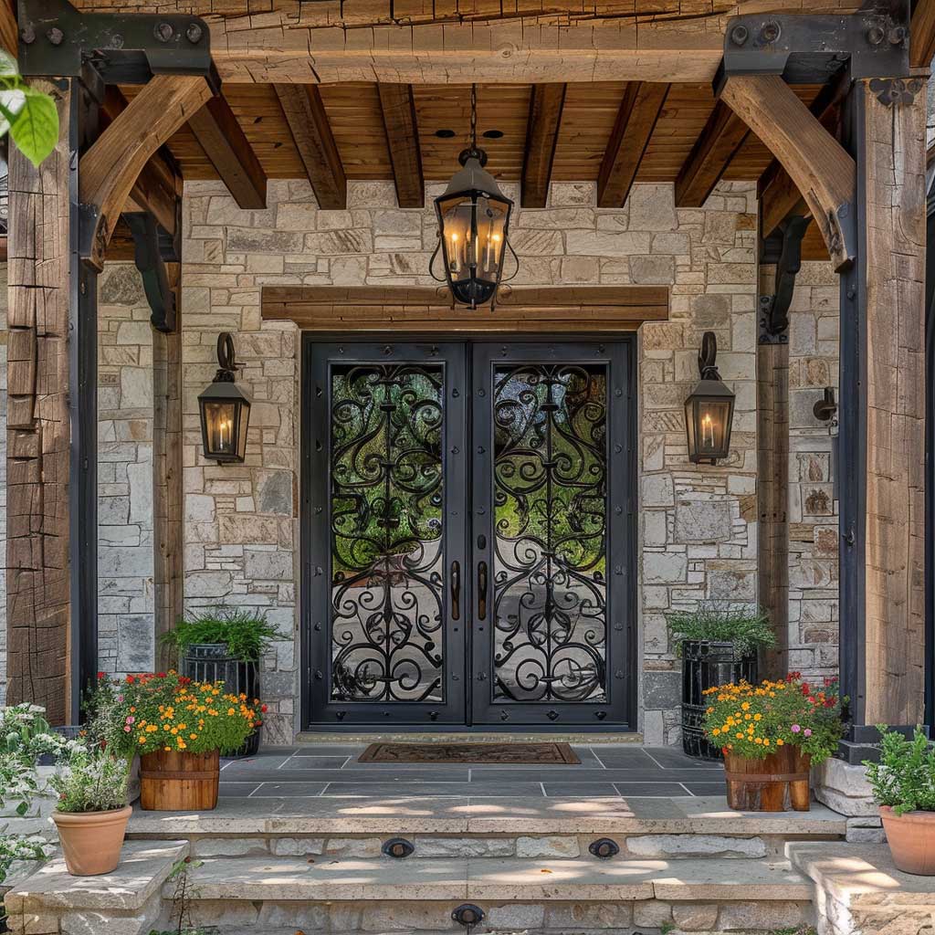 Set in a countryside home entrance with wooden beams and a cozy porch, these doors create a welcoming and homey atmosphere. The natural wood elements and the rustic iron doors complement each other beautifully, enhancing the overall charm of the home. The cozy porch, with its comfortable seating and potted plants, further adds to the inviting feel, making the entrance a perfect place to relax and enjoy the outdoors.