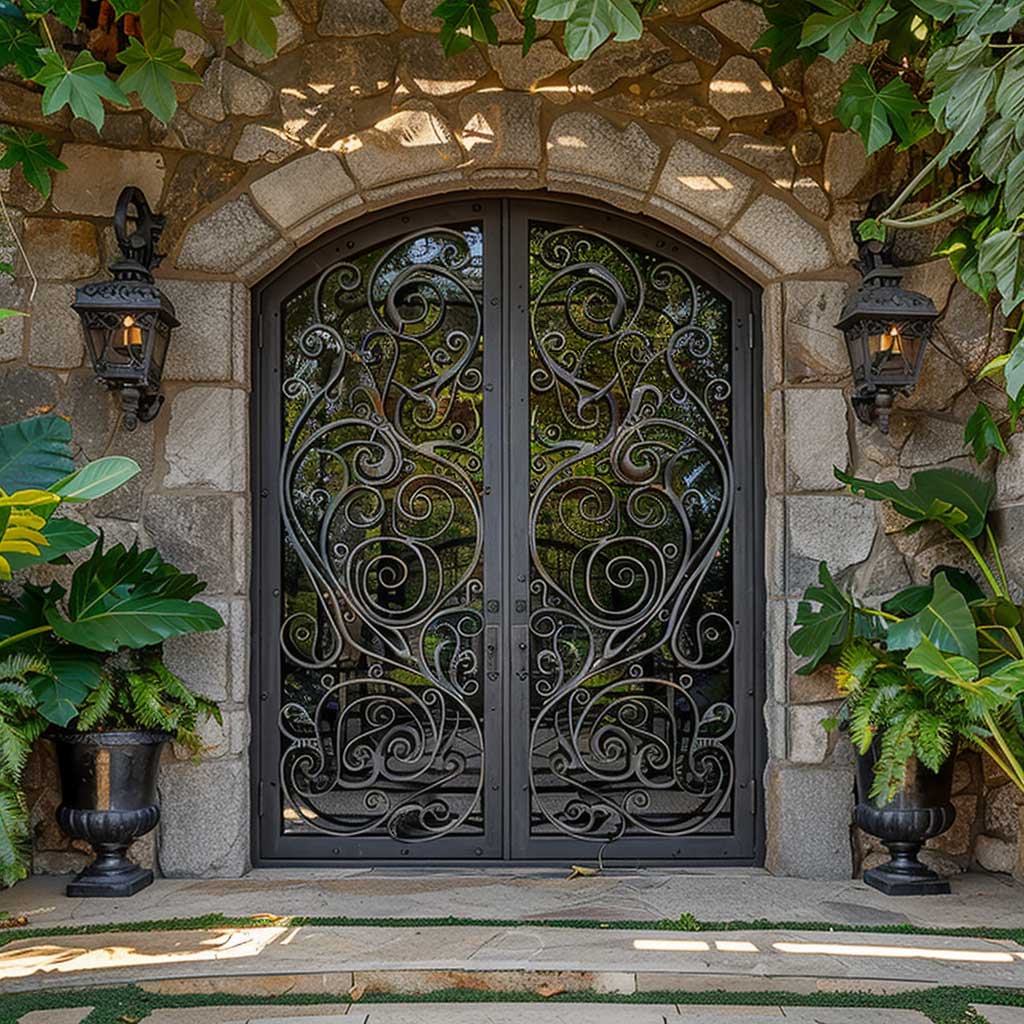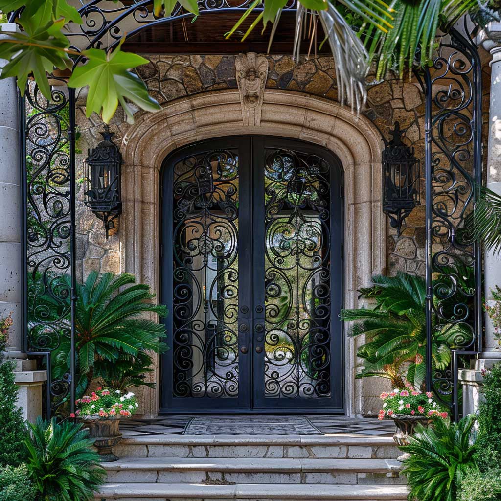 This design is particularly stunning when set against a grand entryway with stone walls. The contrast between the cold, hard stone and the delicate ironwork creates a visually striking effect. The lush greenery surrounding the entry further accentuates the door’s beauty, making the entrance feel like a serene, welcoming garden.