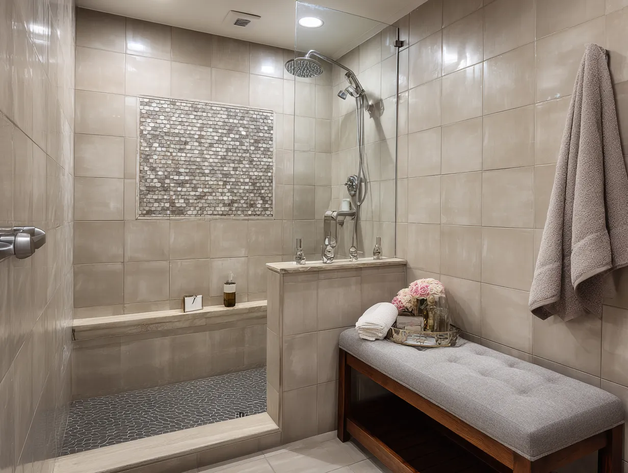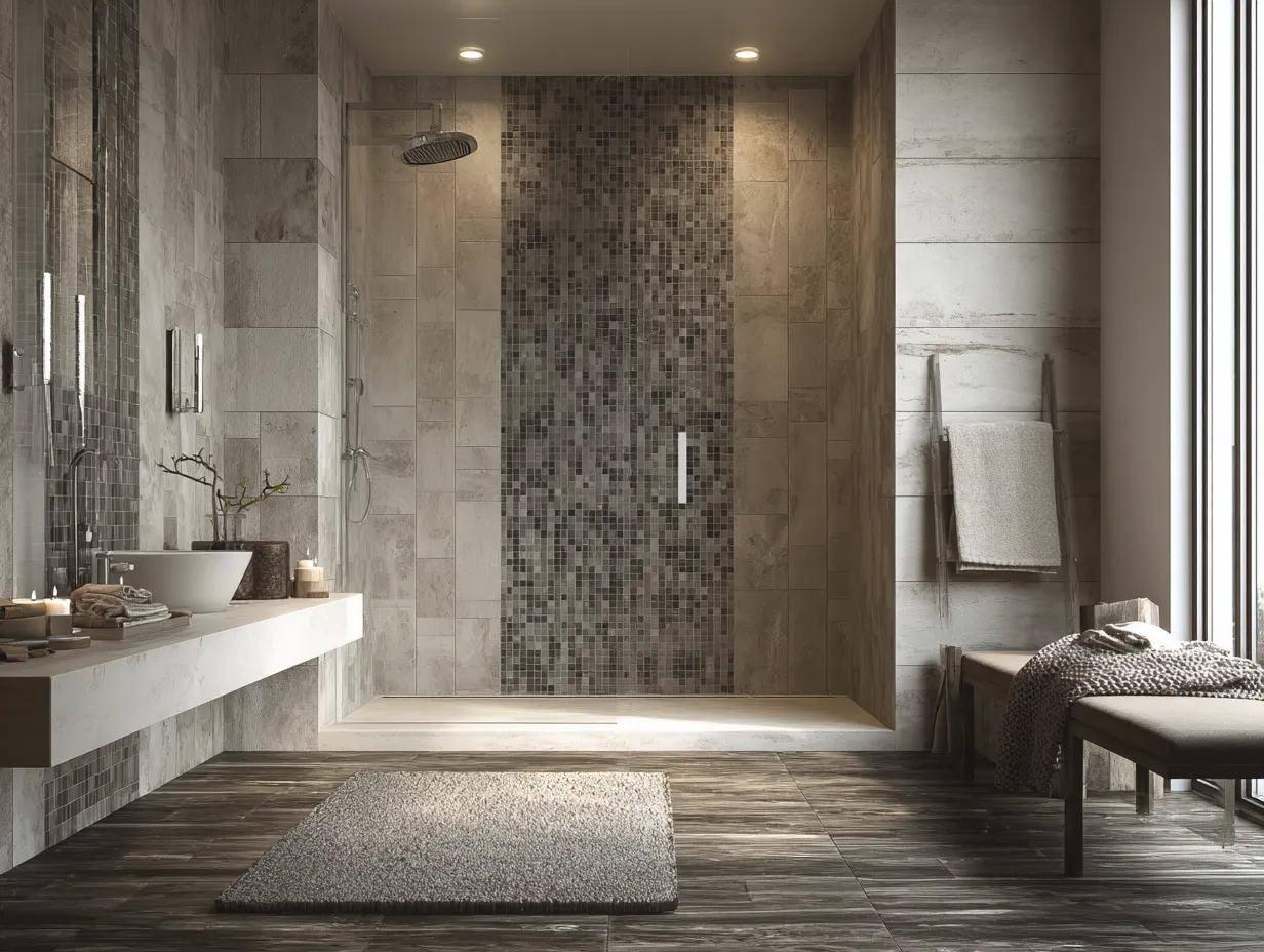 These combinations suit those who appreciate architectural order and clean contrast. The beige and charcoal dynamic keeps the space modern, while the inset detail brings a level of luxury usually found in high-end interiors. These shower tile ideas elevate function into design, offering elegance without clutter.