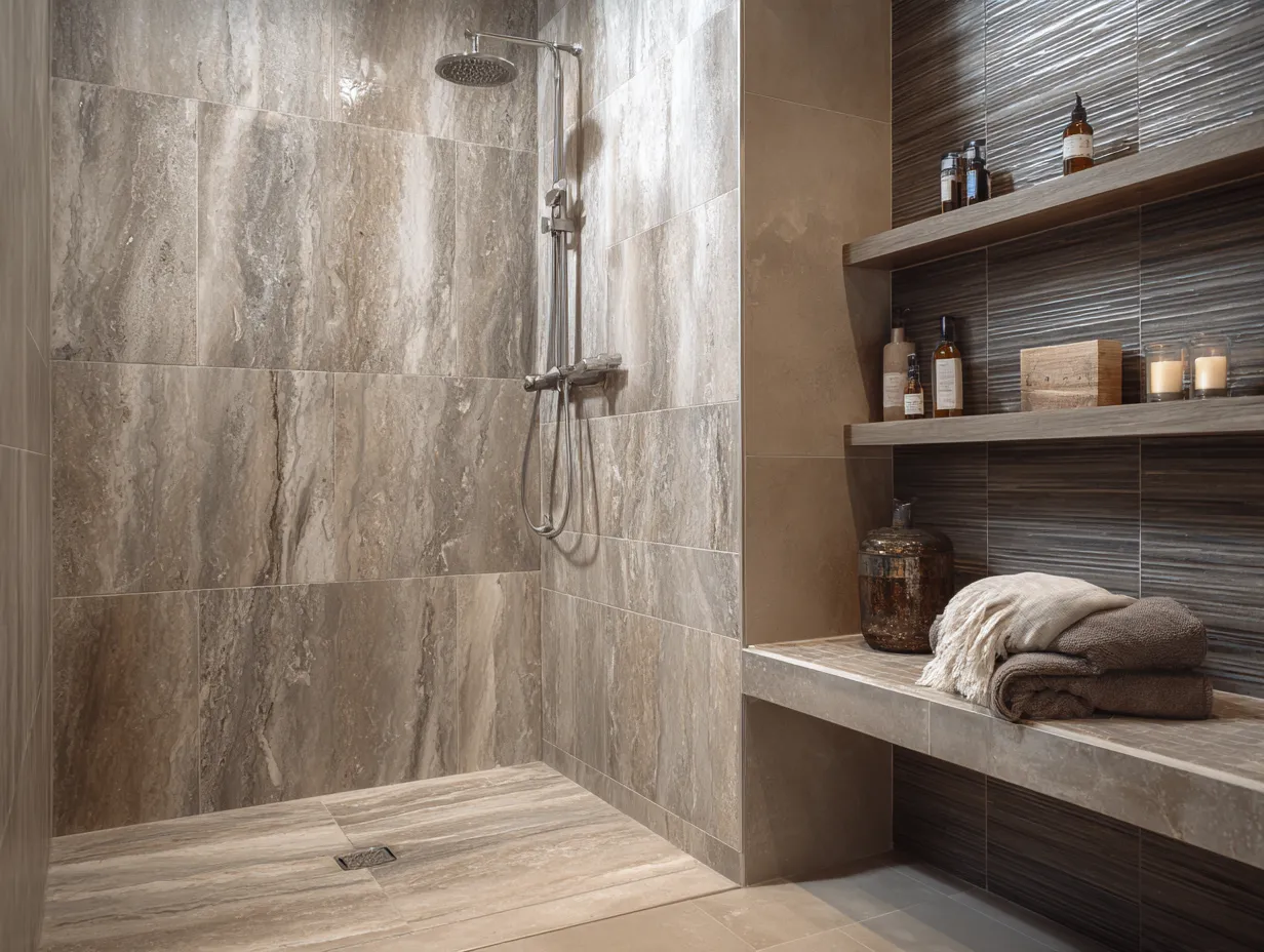 Large-format charcoal slabs paired with beige-tiled niches bring sleek simplicity with built-in depth. These shower tile ideas work with scale and contrast to introduce structure while highlighting functional spaces like product shelves or recessed storage.